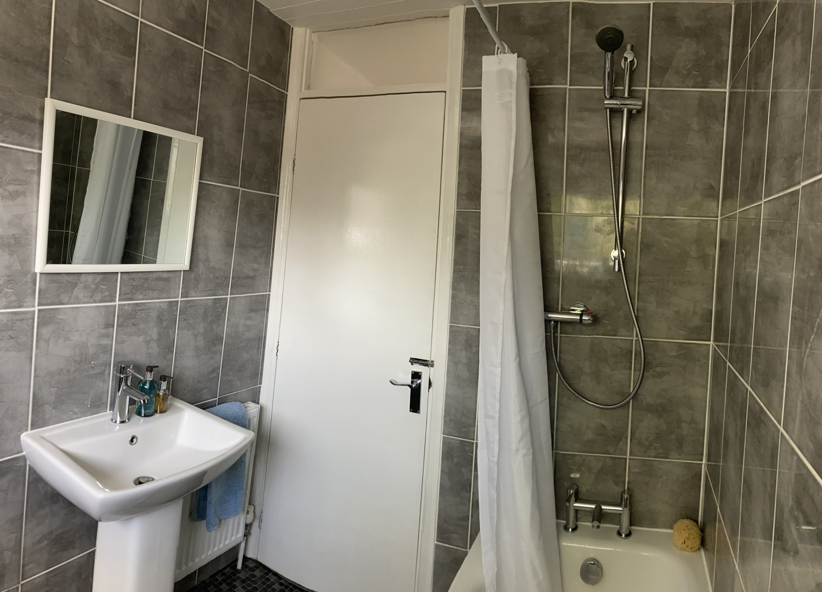 A fully tiled re-fitted bathroom comprising of a contemporary white suite, a low level w.c., pedestal wash hand basin with monobloc mixer tap, bath with mixer tap and separate thermostatic shower over. Flush light fitting. Obscure glass uPVC double glazed window. Radiator.