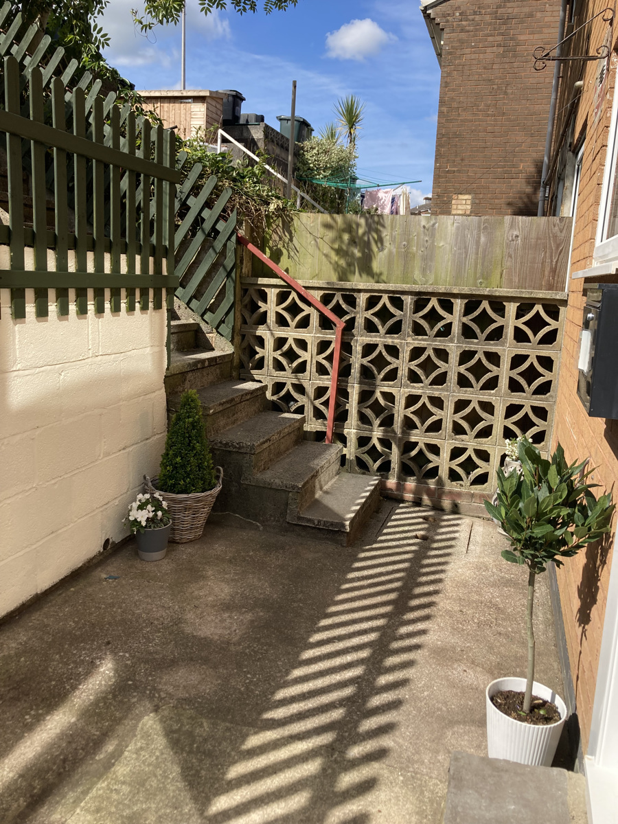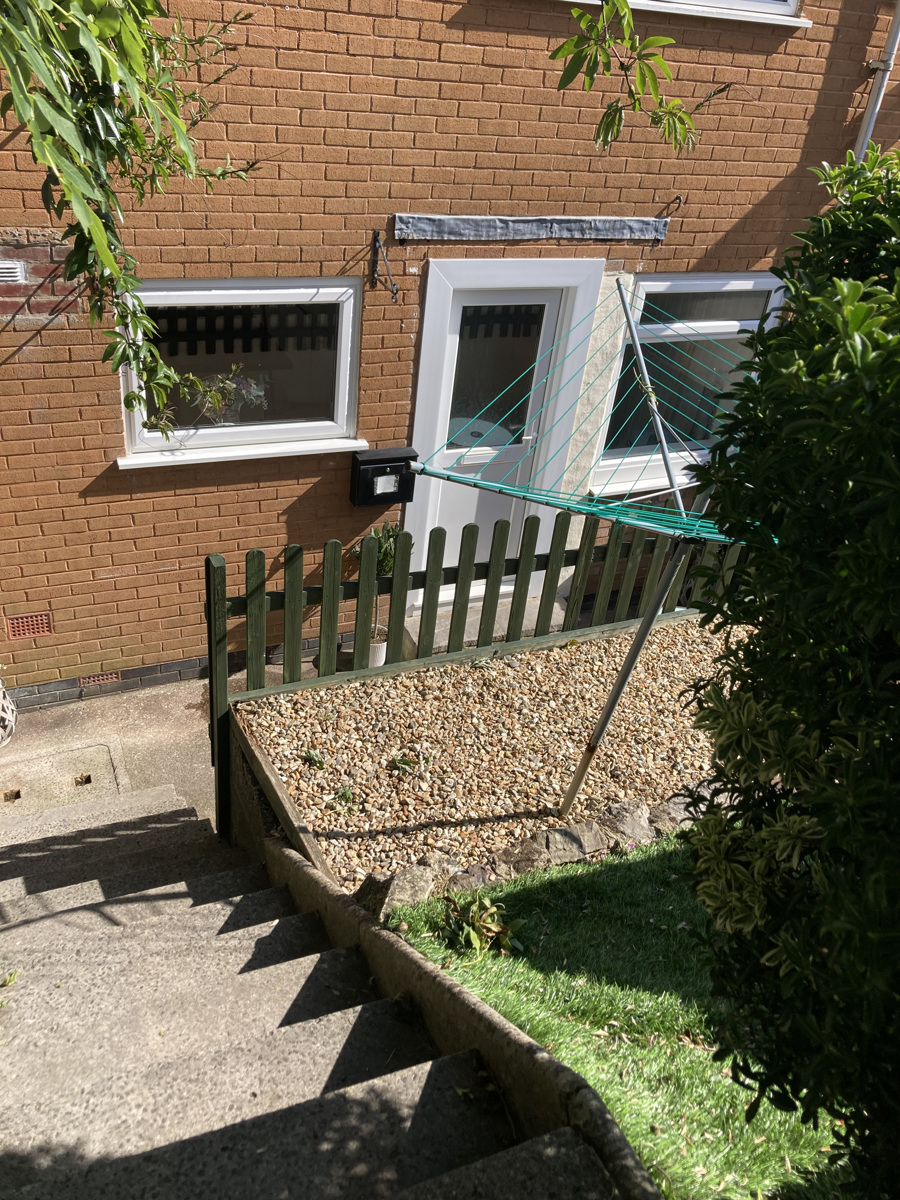 Terraced garden area laid to established dwarf trees and bushes. Steps with steel handrail lead up to the uPVC half double glazed door that leads into the living room.