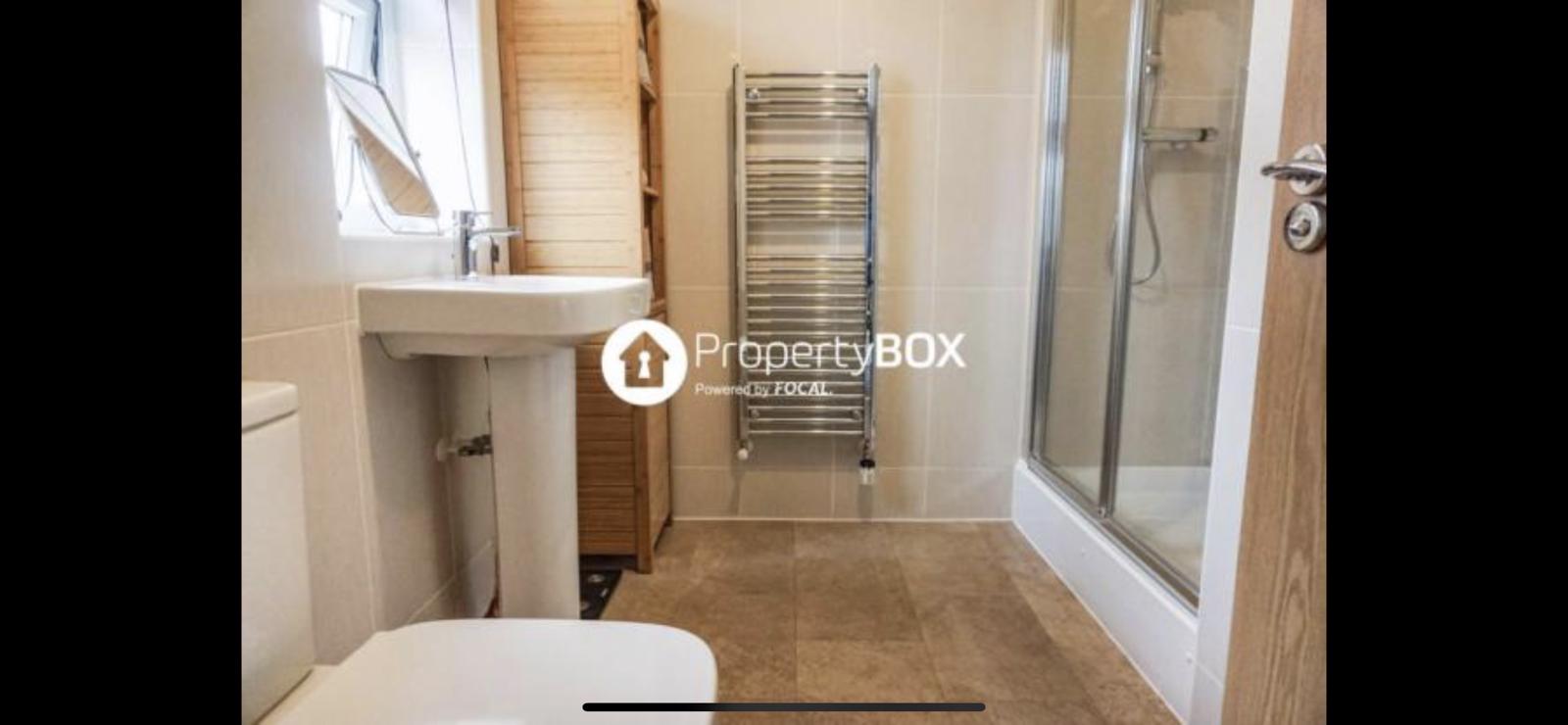 Frosted window to the side, double shower cubicle, WC, sink, fully tiled surround, heated towel rail