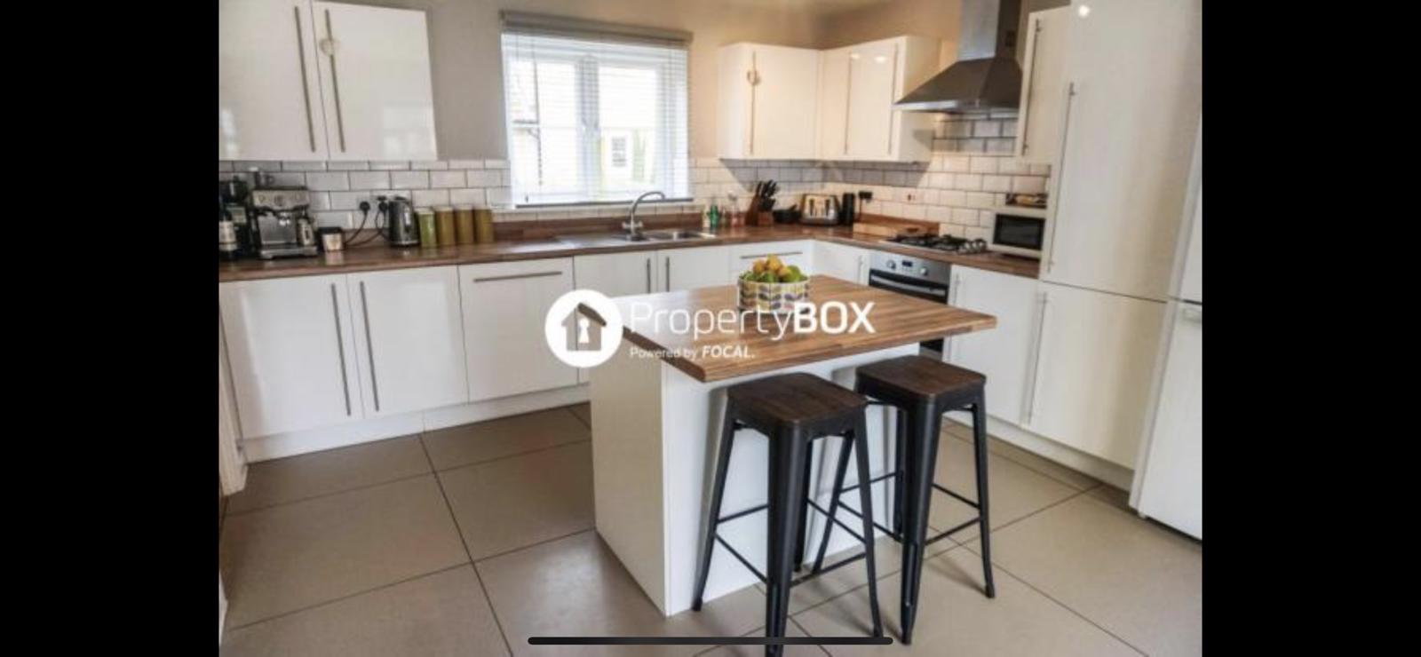 Island seating two people with storage, 2 x french doors leading to garden, fitted with matching wall and base units, recently fitted spot lights for plenty of light, Gas stove, electric oven, integrated washing machine, tiled flooring, access to utility room, space for dining table or additional living area. 6m x 5m