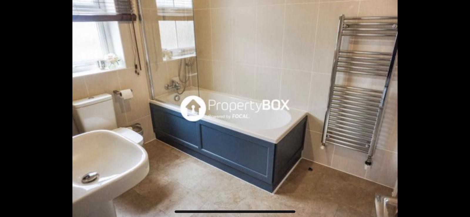 Frosted window to the front, deep panelled bath with shower, WC, sink, fully tiled surround, heated towel rail, access to room 2 and landing.