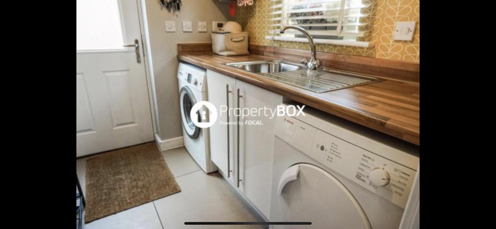 space to hang jackets, access from the off road parking, leads into kitchen area, sink, washing machine, tumble drier, base unit for storage. 1.8m x 2m