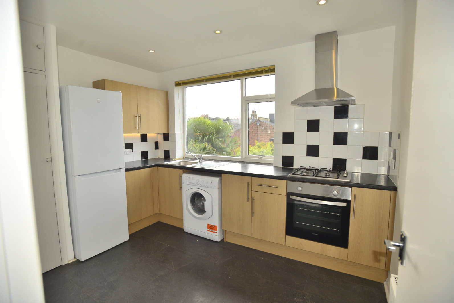 Which has fitted wall and floor units with a granite effect worksurface and tiled splashbacks incorporating a sink and drainer - situated beneath a wide casement and picture window looking to the rear. The kitchen has a gas hob and an electric oven, with a stainless-steel extractor hood, a fridge/freezer and washer/dryer, a small cupboard housing the central heating boiler and space for a small table and chairs