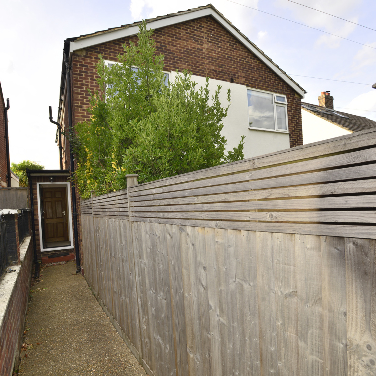 At the side of the maisonette, is an access driveway leading to a single garage, with