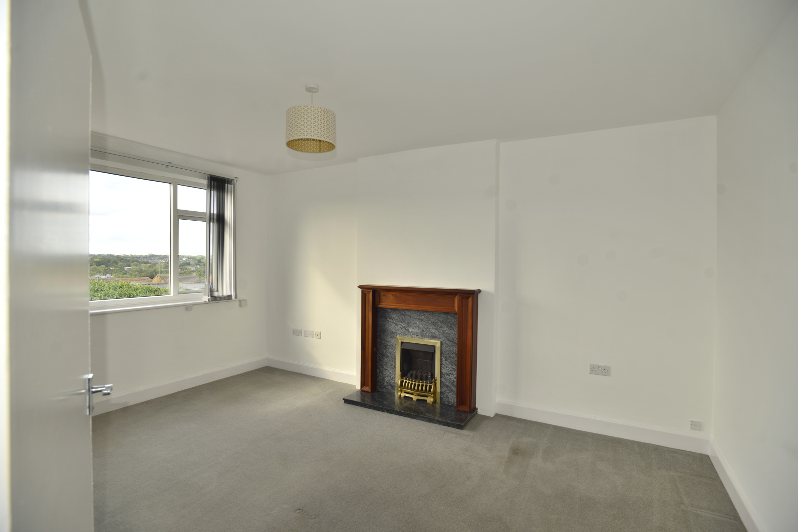 Which has a run of double-glazed casement and picture windows - giving far reaching views to the to the rear - a fireplace and wooden surround - and fitted carpets.