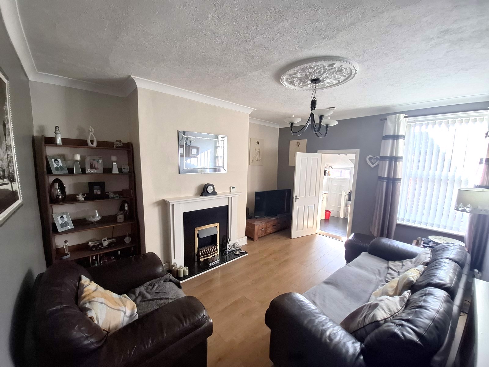 Living room: 12'11 x 15'8 Oak style laminate flooring . The focal point is a modern fireplace, white fire surround, marble hearth and convenient electric fire. There are telephone/television points and a double radiator with decorative cover. A light and airy room. Door to kitchen.