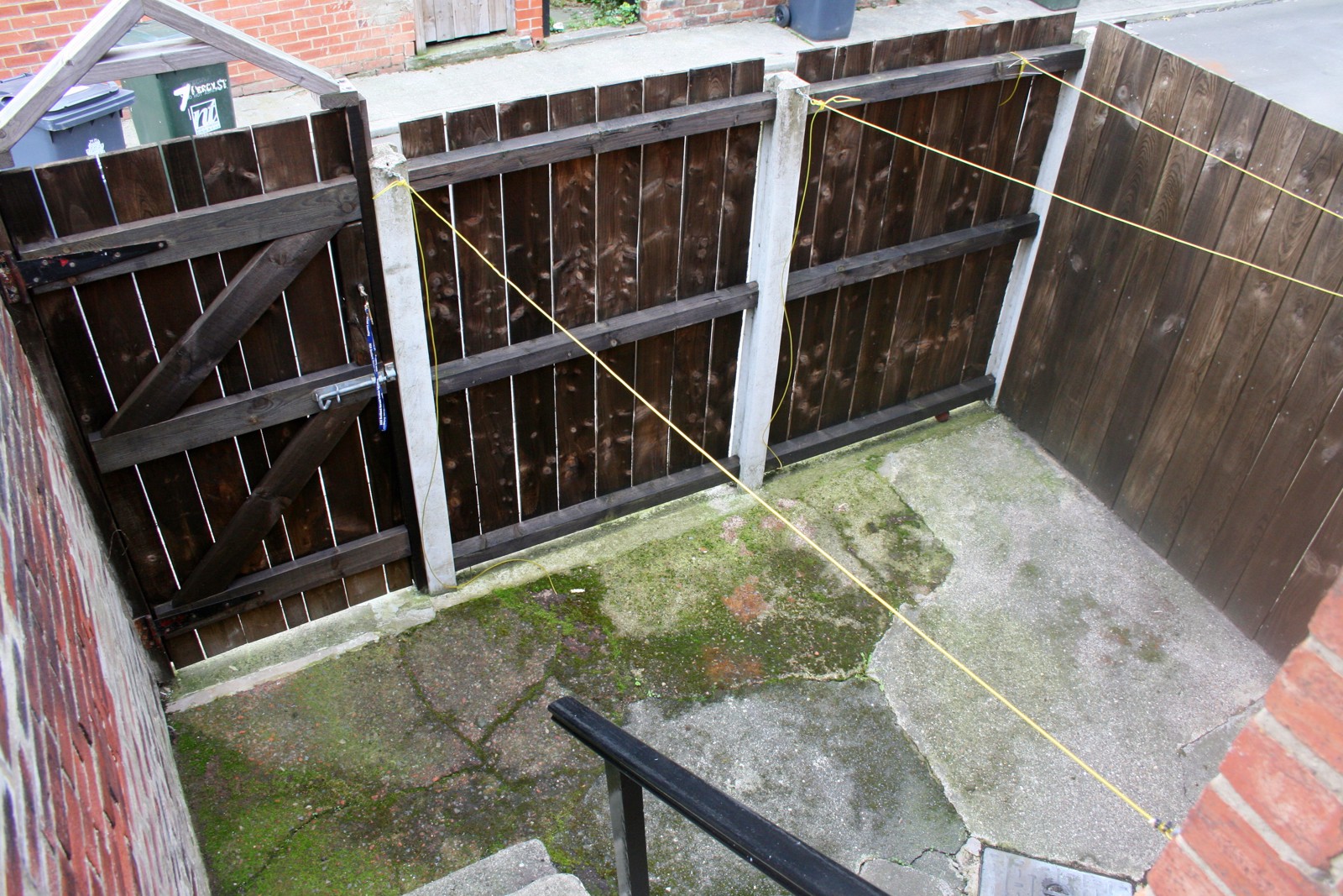External stairs leads down to a small secure yard area, with timber fencing and door.