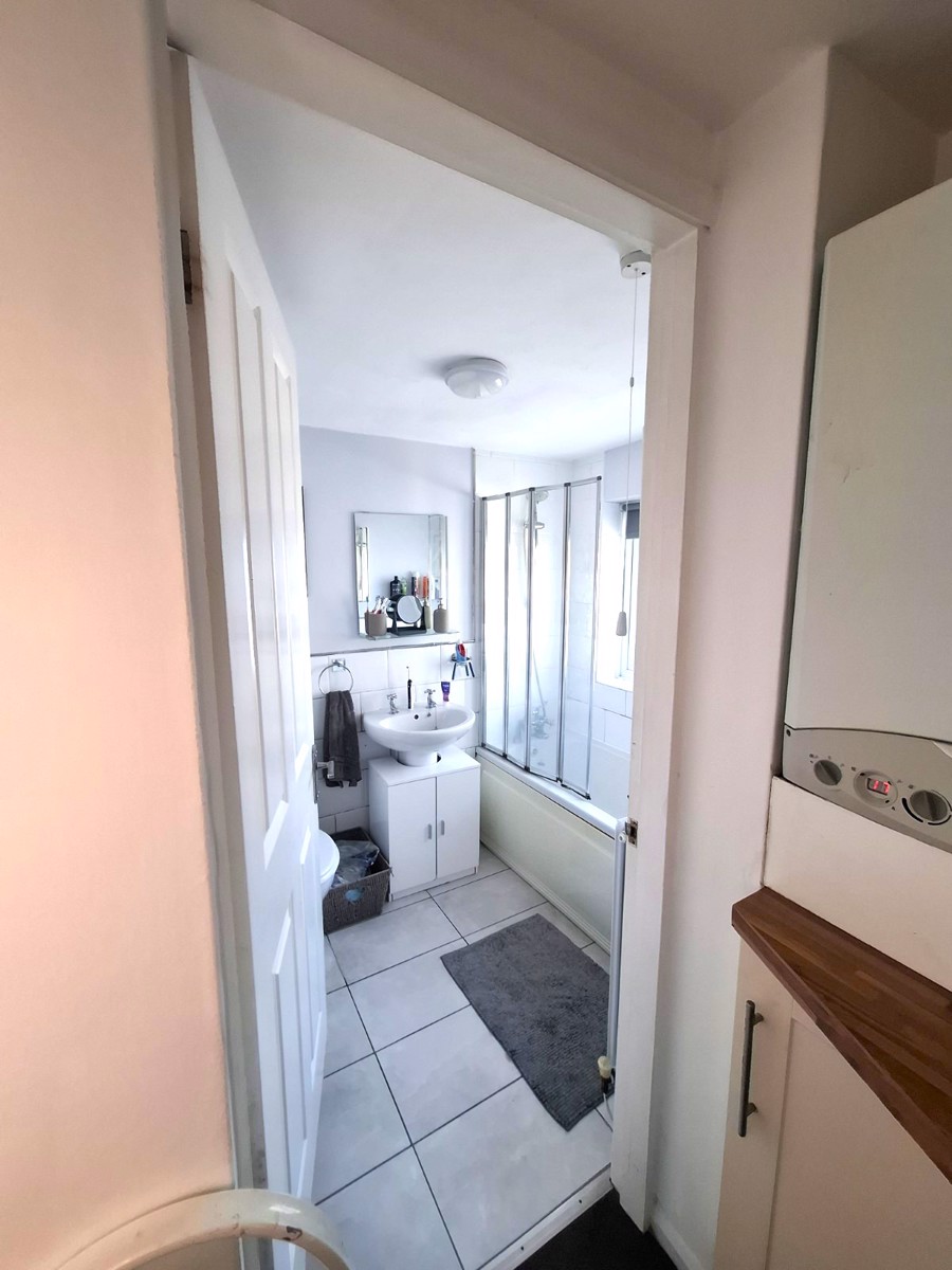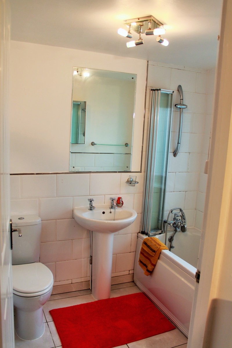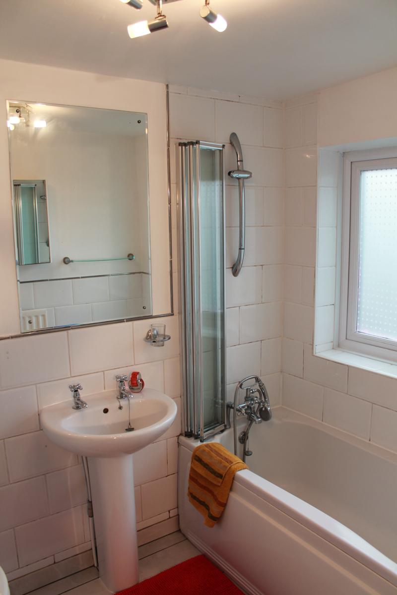 Bathroom: Three piece white suite comprising of panel style bath with shower screen and wall mounted shower mixer, ceramic pedestal hand wash basin and w.c. , radiator recently installed.