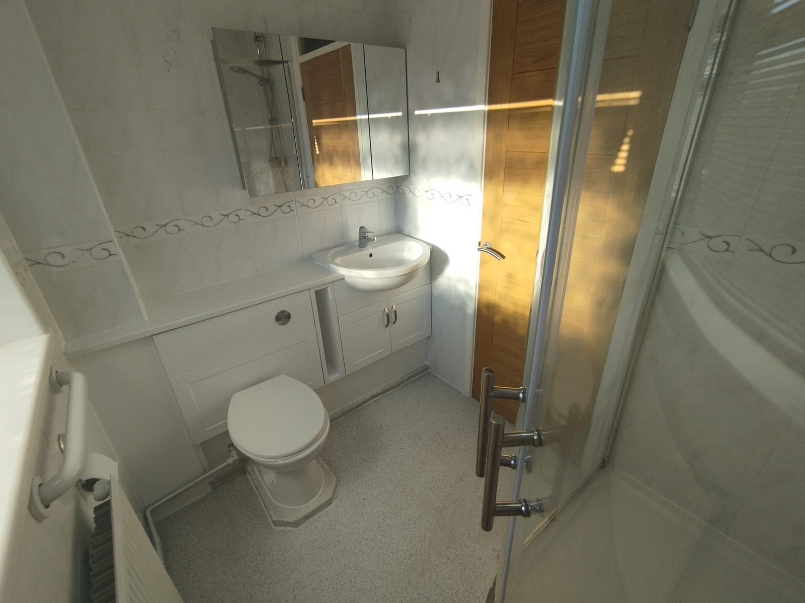 Modern suite in white comprising shower enclosure, vanity wash hand basin and w.c., upvc double glazed window to rear aspect.