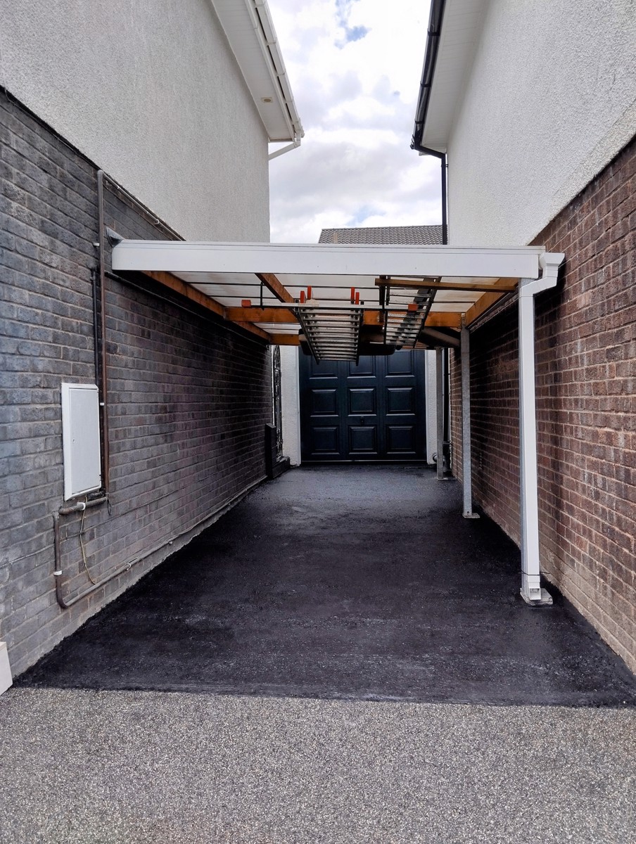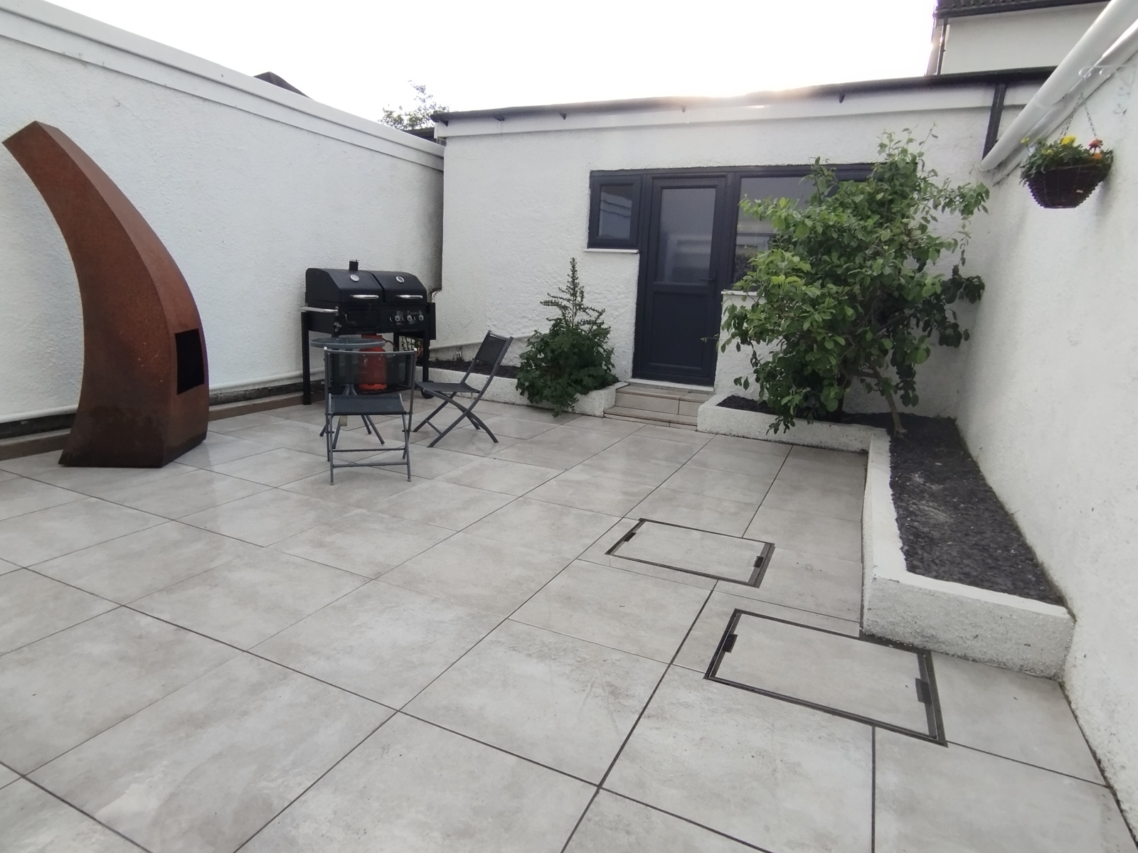 Driveway with car port off- road parking to Garage. Front mature gardens laid to lawn with rear paved area