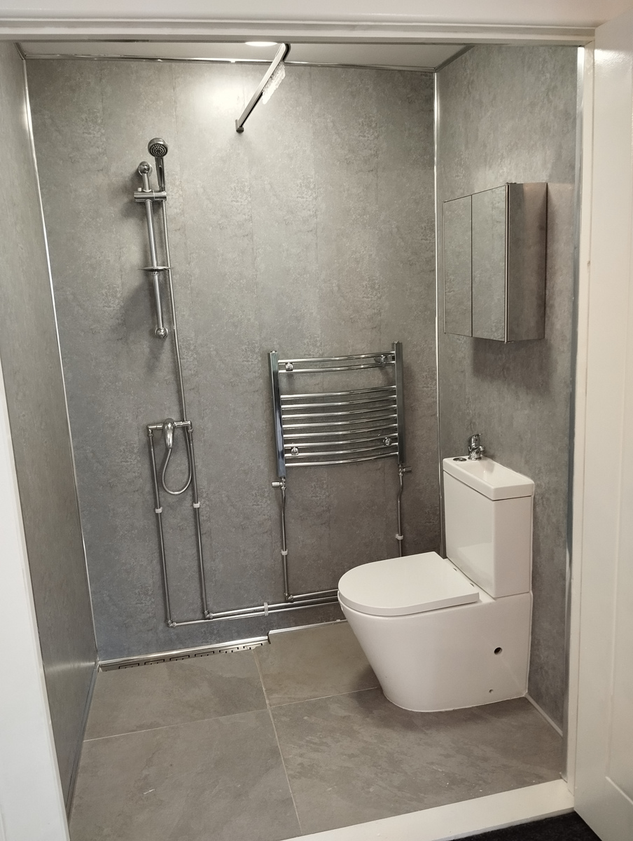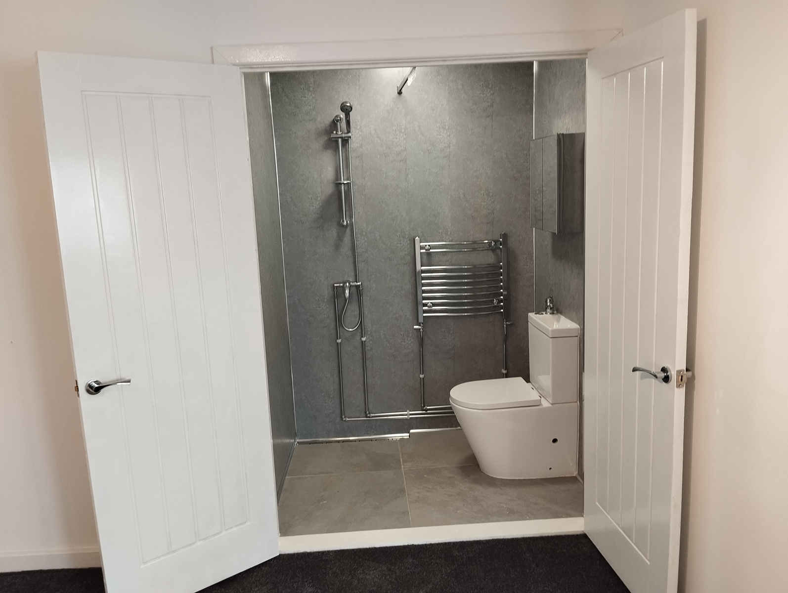 Double doors wheelchair accessible with towel radiator and w,c hand basin and shower curtain
