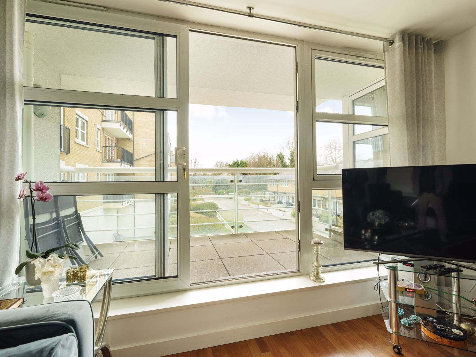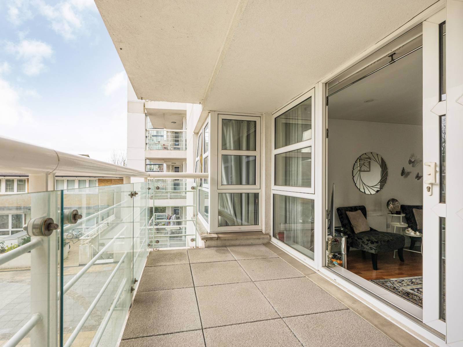 Balcony with full-height windows, ensuring abundant natural light and a sense of serenity in a vibrant suburb.