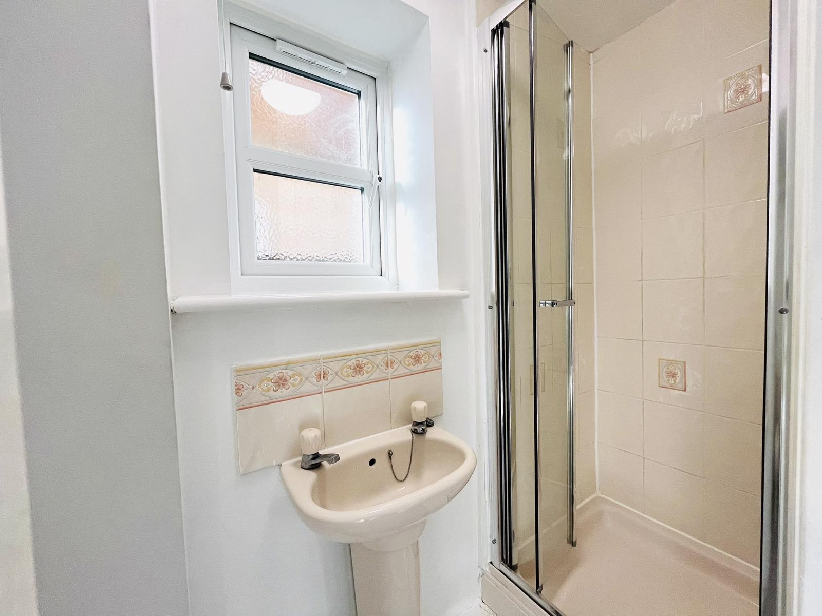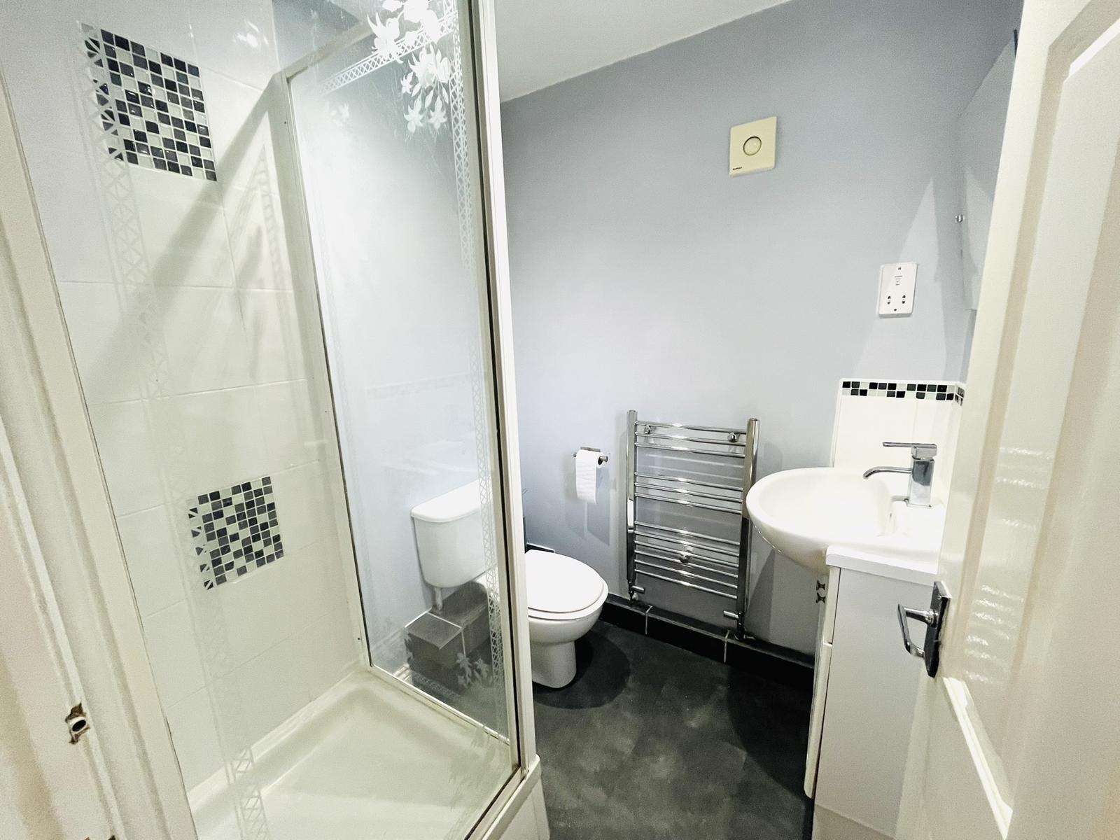 Shower cubicle with Aqualisa shower & chrome folding door, wash basin, low level W.C, uPVC obscure double glazed window, radiator, extractor fan.