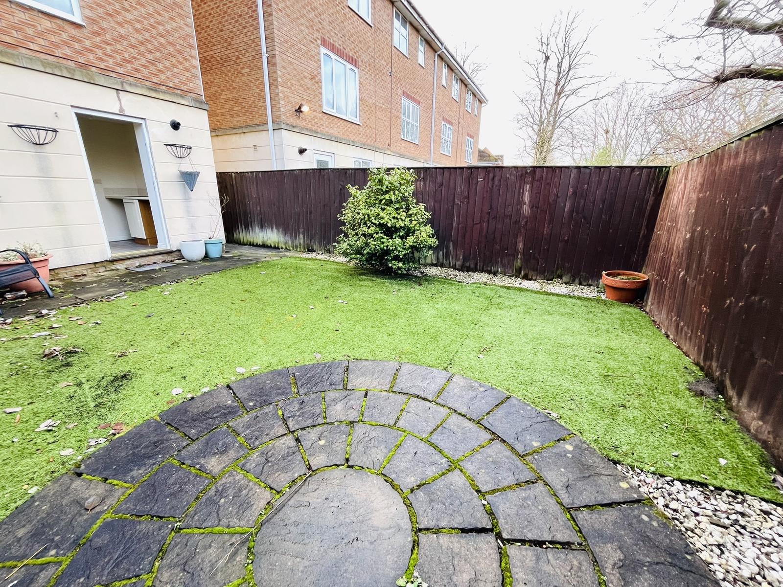 To the rear, you'll find a low maintenance private rear garden, backed by mature trees, ponds and woodland, complemented by two patio areas perfect for outdoor dining and entertaining. Being an end townhouse the side access to the rear garden from the driveway also provides extra space for wheelie bins at the side of the property. To the front, a spacious hard surfaced driveway provides full width parking for two vehicles in addition to the integral full sized double garage with up and over door. The garage could offer expansion potential, perhaps for a fourth bedroom, gym or home office subject to approval from the relevant bodies.