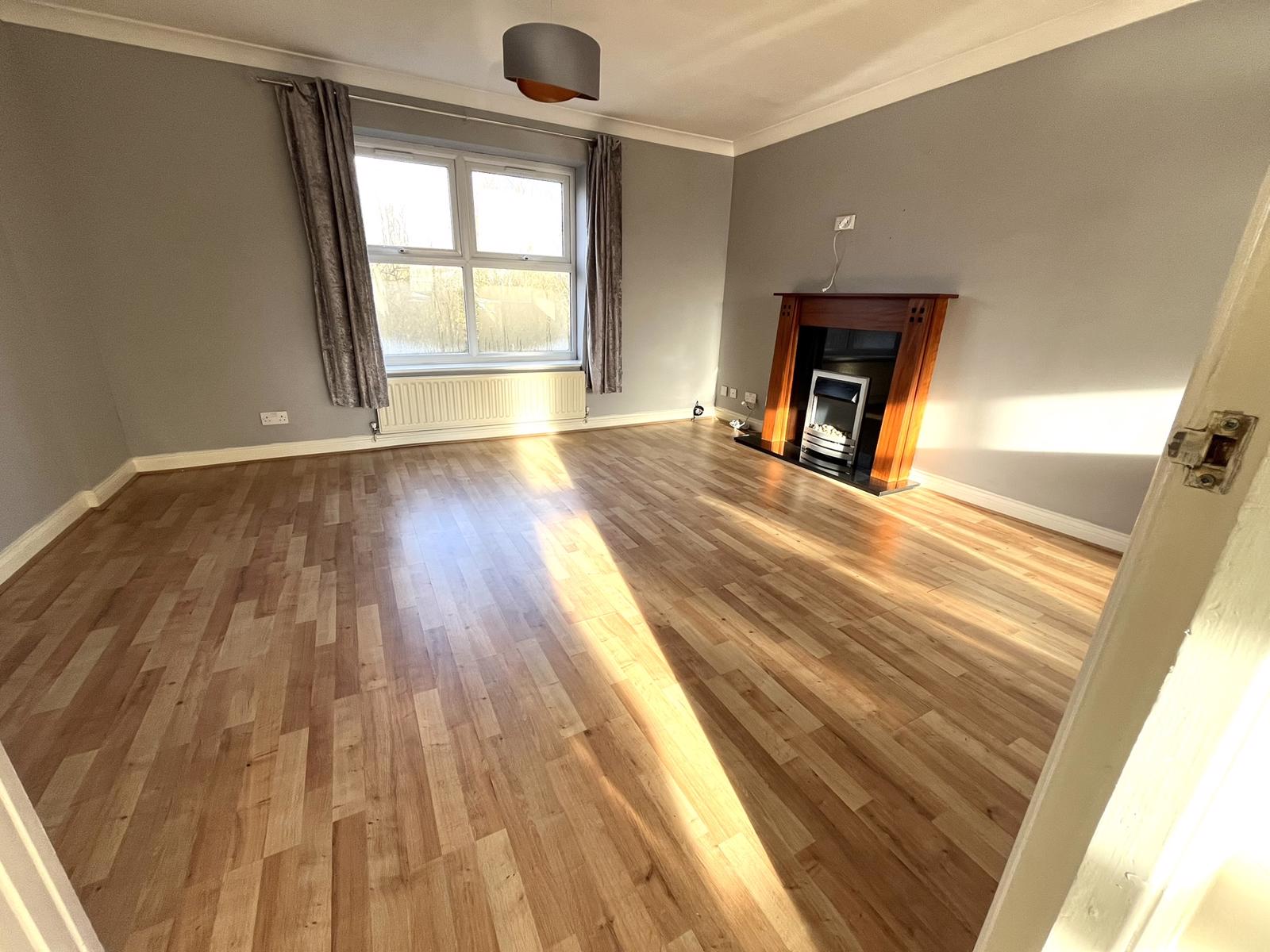 L-shaped room, uPVC double glazed windows to the front, side and rear, two radiators, feature fireplace, dining area, TV aerial point, power points, kitchen with high gloss cream wall & base units, timber strip laminate work surfaces with stainless sink, integrated stainless steel oven, stainless extractor (full extraction not recirculating), induction hob, integrated dishwasher, integrated fridge & freezer, power points.