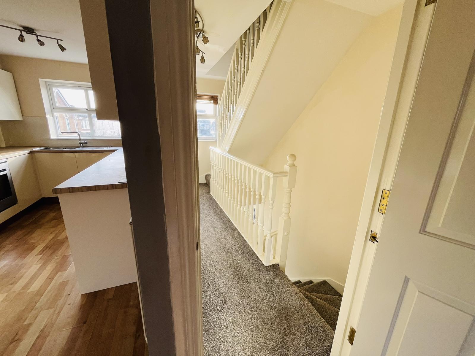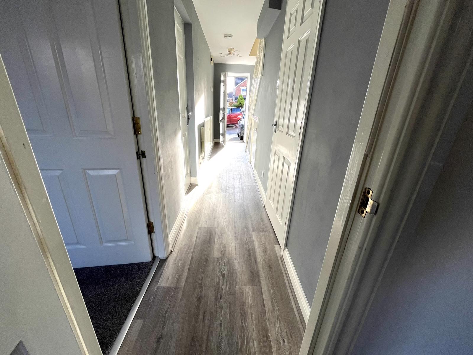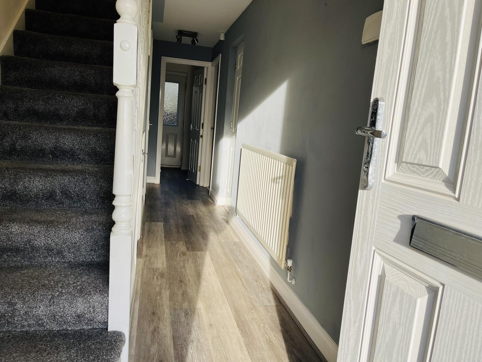 Entrance door, staircase leading to the first floor, radiator, laminate floor, large understairs storage cupboard, power points, intruder alarm keypad.