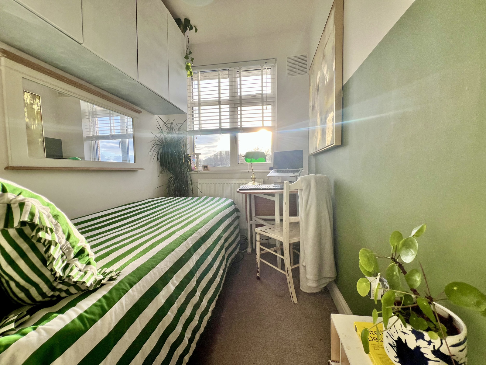 Living / Dining Room: Features a large double-glazed bay window, with views of London, bespoke plantation shutters, central heating, and engineered oak flooring. The removal of chimney breasts enhances the sense of space.