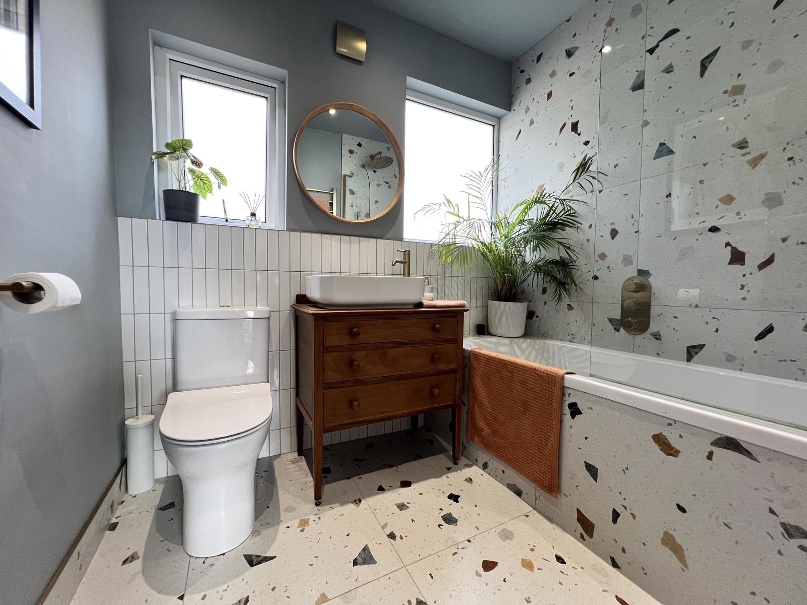 Bathroom: A recently installed three-piece suite with a rainfall shower over the bath, large terrazzo-style tiles, high-quality brushed gold fittings, and a towel heater.