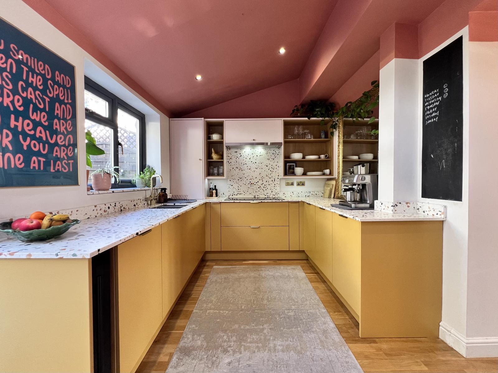Kitchen: This newly installed bespoke kitchen is elegantly finished in Farrow and Ball colours, handpicked by the vendor. It boasts exquisite Italian terrazzo worktops, open shelving, and brushed gold hardware. The kitchen is equipped with integrated appliances, including a dishwasher, fridge freezer, and built-in bins. It also features a spacious double pantry, an AEG smart oven, a coordinating AEG microwave oven, and an instant hot water tap. Double French doors open onto the patio and lawn, while a Velux window ensures ample natural light and includes an automatic rain closure feature.