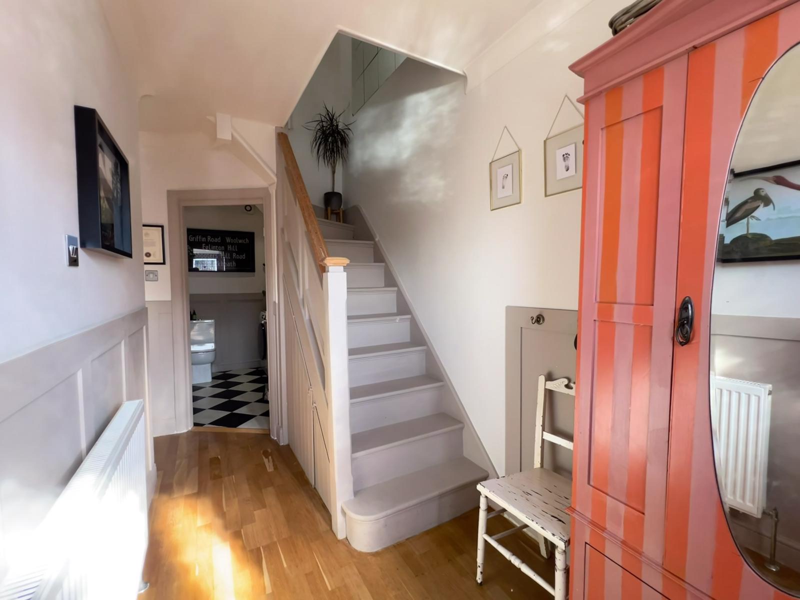 Entrance Hall: A spacious hallway with ample room for coats and shoes. This home retains its original 1930s door with stained glass windows, recently restored to ensure longevity. The walls have been half panelled, in keeping with the age of the property.