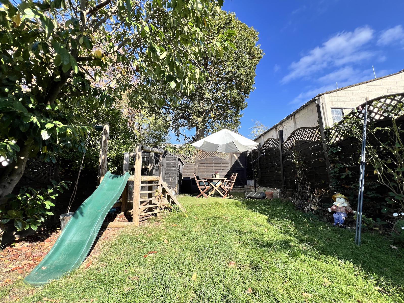 Rear Garden: A sunken patio with external lighting, a lawn with a well-stocked flower bed, and a hard-standing area at the back with a wooden shed and outdoor seating. Rear garden access is available via a shared access road.