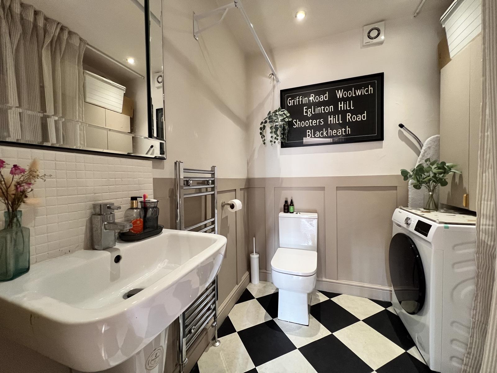 Utility Room / WC: A versatile space equipped with a WC, wash basin, towel heater, and room for a washing machine and / or shower. Plumbing from a previous shower remains intact for easy reinstatement. The panelling from the hallway continues into the utility room creating a nice feeling of continuity.