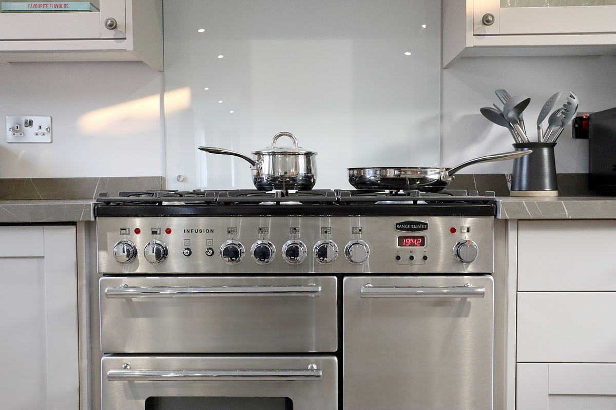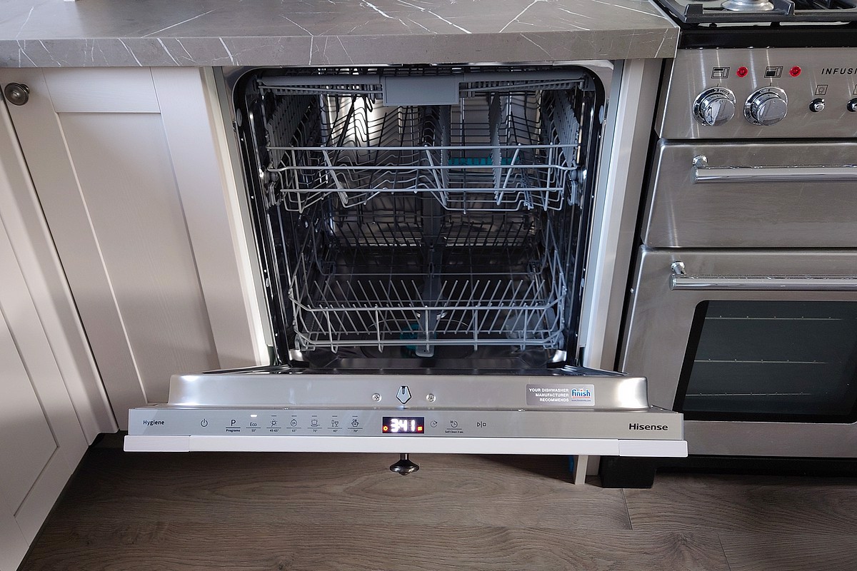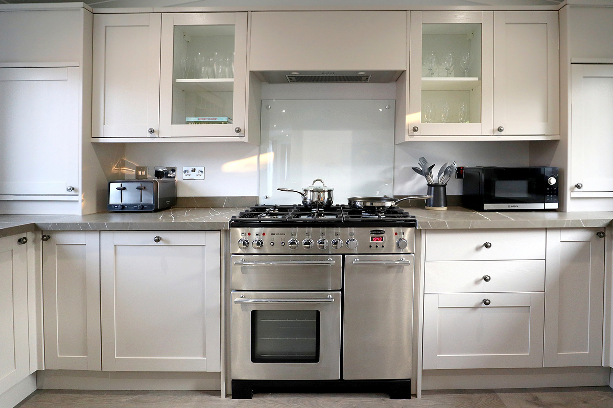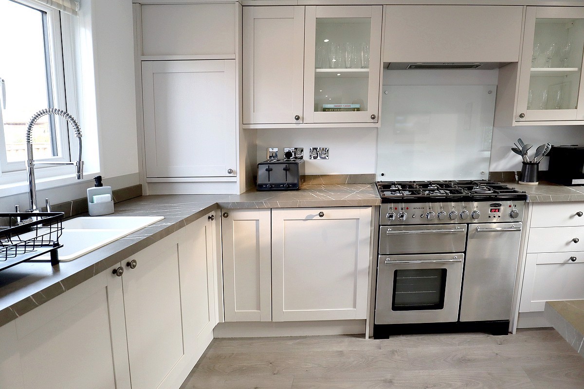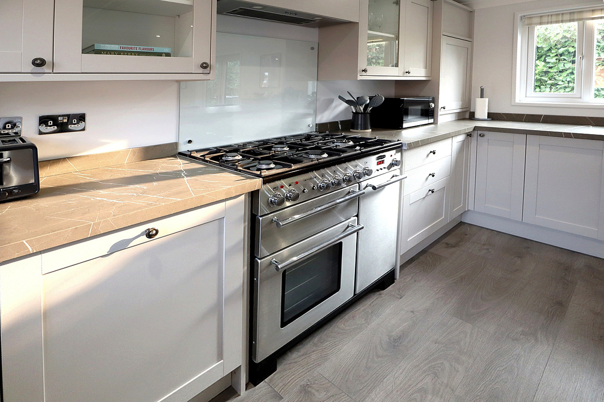 OPEN-PLAN KITCHEN: Fully equipped Howdens kitchen, with range cooker, integrated hood, dishwasher, and American-style fridge freezer, sliding dual-bin under sink. The ample dining/bar area comes with height-bar stools. Smoke and carbon monoxide alarm. Roller blinds for both windows. Grey laminated floor.