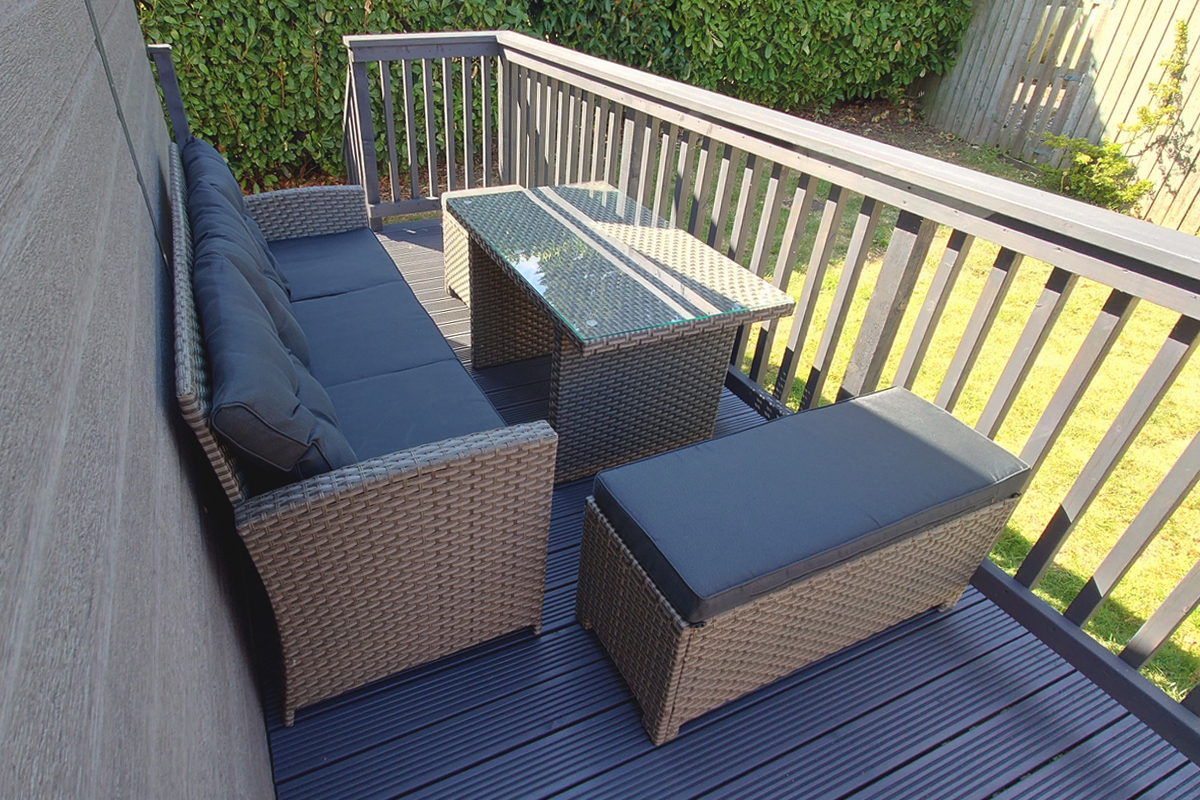 The open-plan area features a fully equipped kitchen, dining area and lounge. The master bedroom is fitted with bespoke integrated wardrobes and a king-size bed. The secondary bedroom is fitted with bespoke integrated wardrobe and a bunk beds. Private parking on the driveway, decking area and private garden at the back.