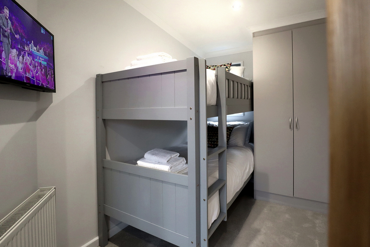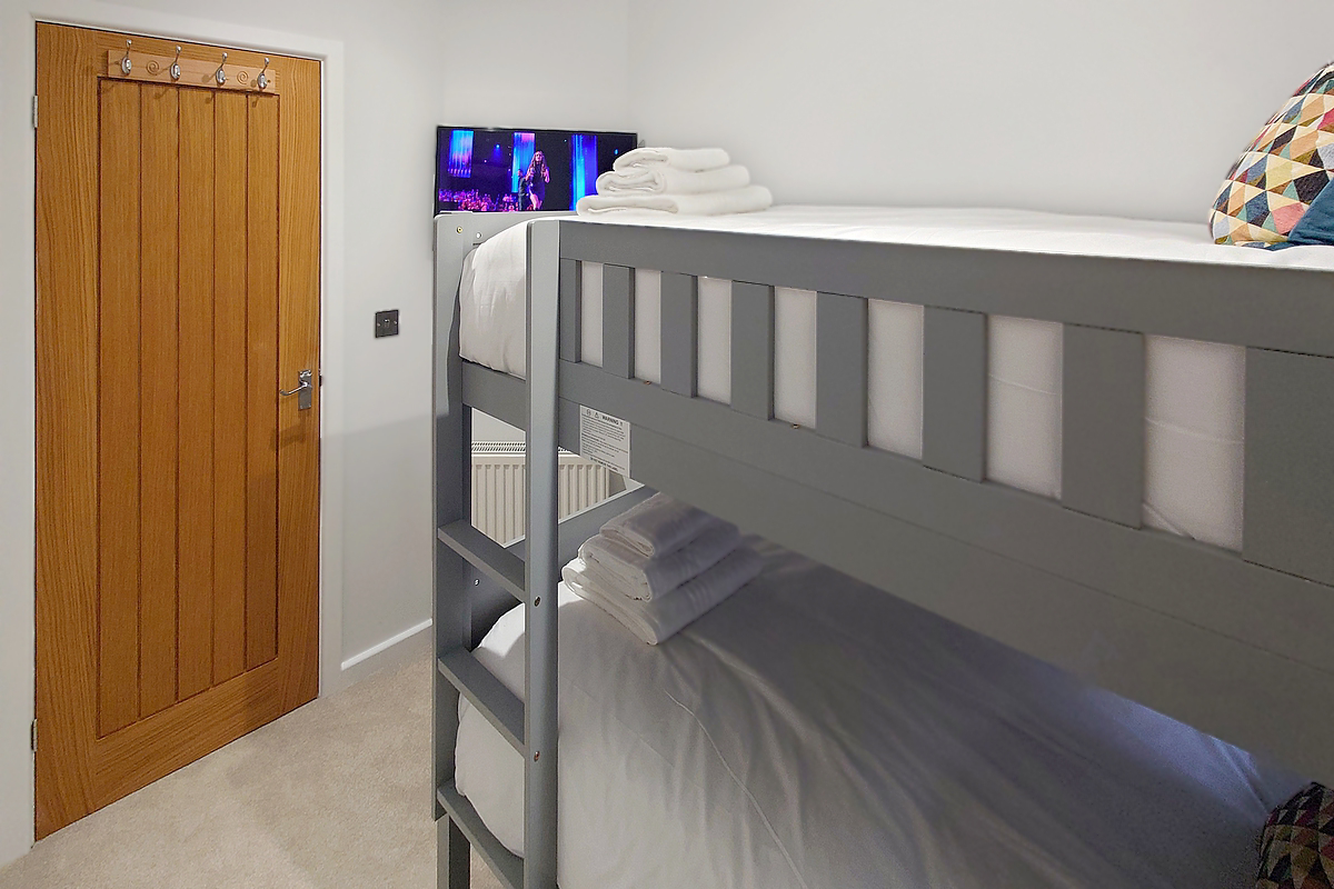 SECONDARY BEDROOM: Fitted with bunk beds (90x200cm). Bespoke wardrobe (two doors). Wall mount for flat-screen TV (currently a 32”) with no visible cables. One radiator. Blackout roller blind.