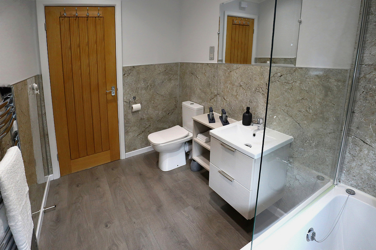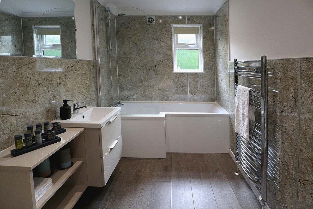 BATHROOM: L-shaped bath with shower and glass panel. Vanity with shelves, drawers and ceramic basin. Toilet. Chrome towel radiator. Frosted glass window with roller blind. Coat rack behind door. Extractor fan. Grey laminated floor.