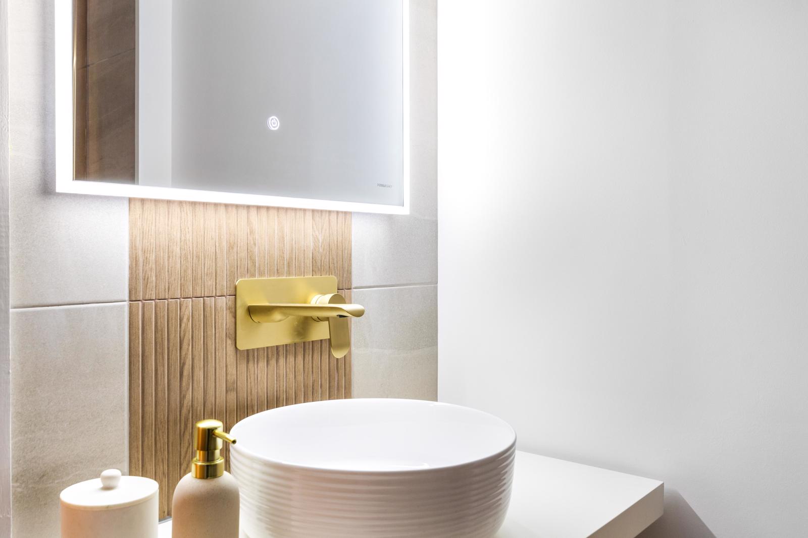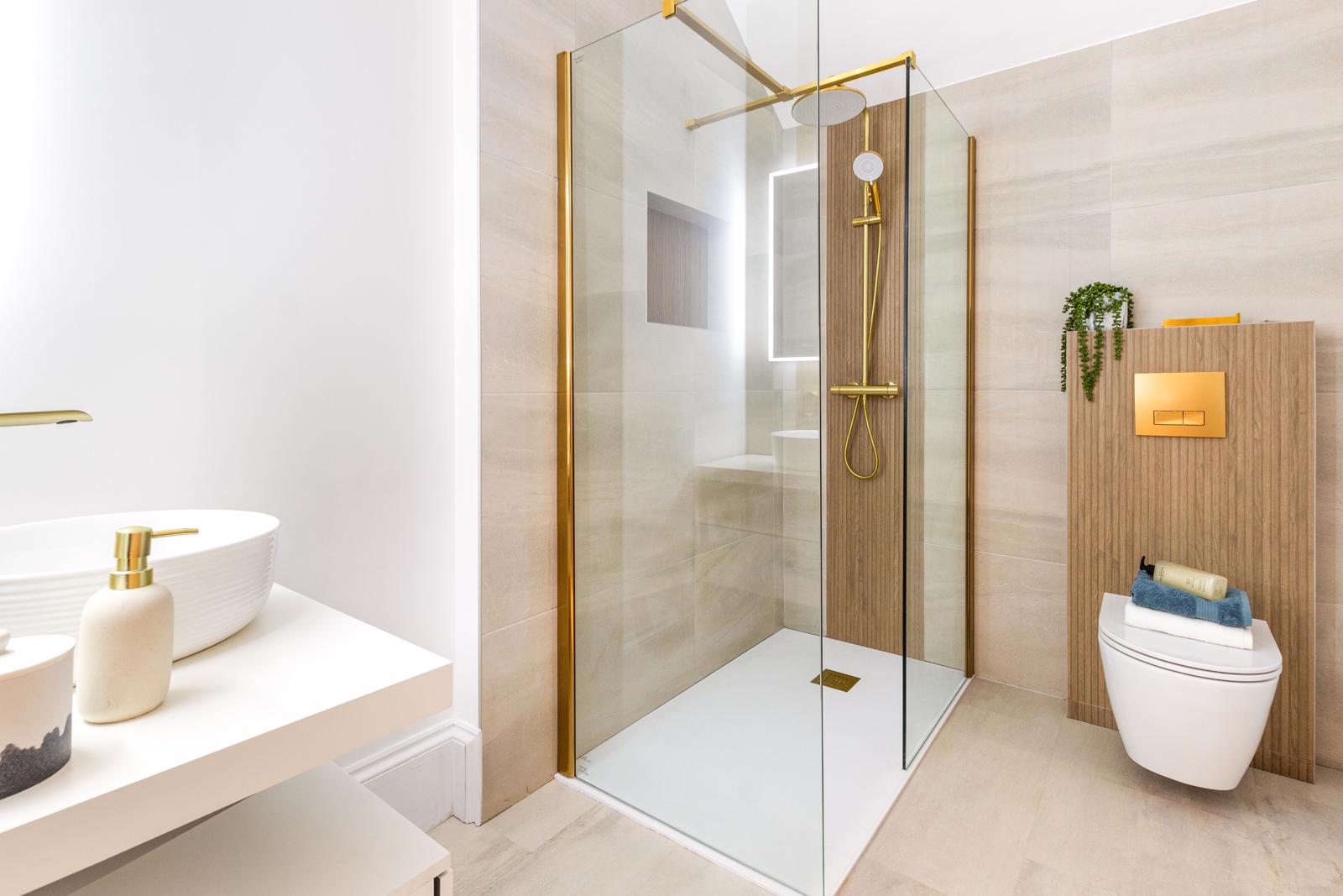 Stylish bathroom with shower, wash hand basin, vanity unit and LED mirror