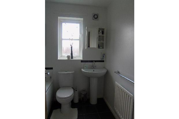 A three-piece suite comprising a panelled bath with a shower over, pedestal wash hand basin, and low-level W.C. Features part-tiled walls, an extractor fan, and a double-glazed privacy window.