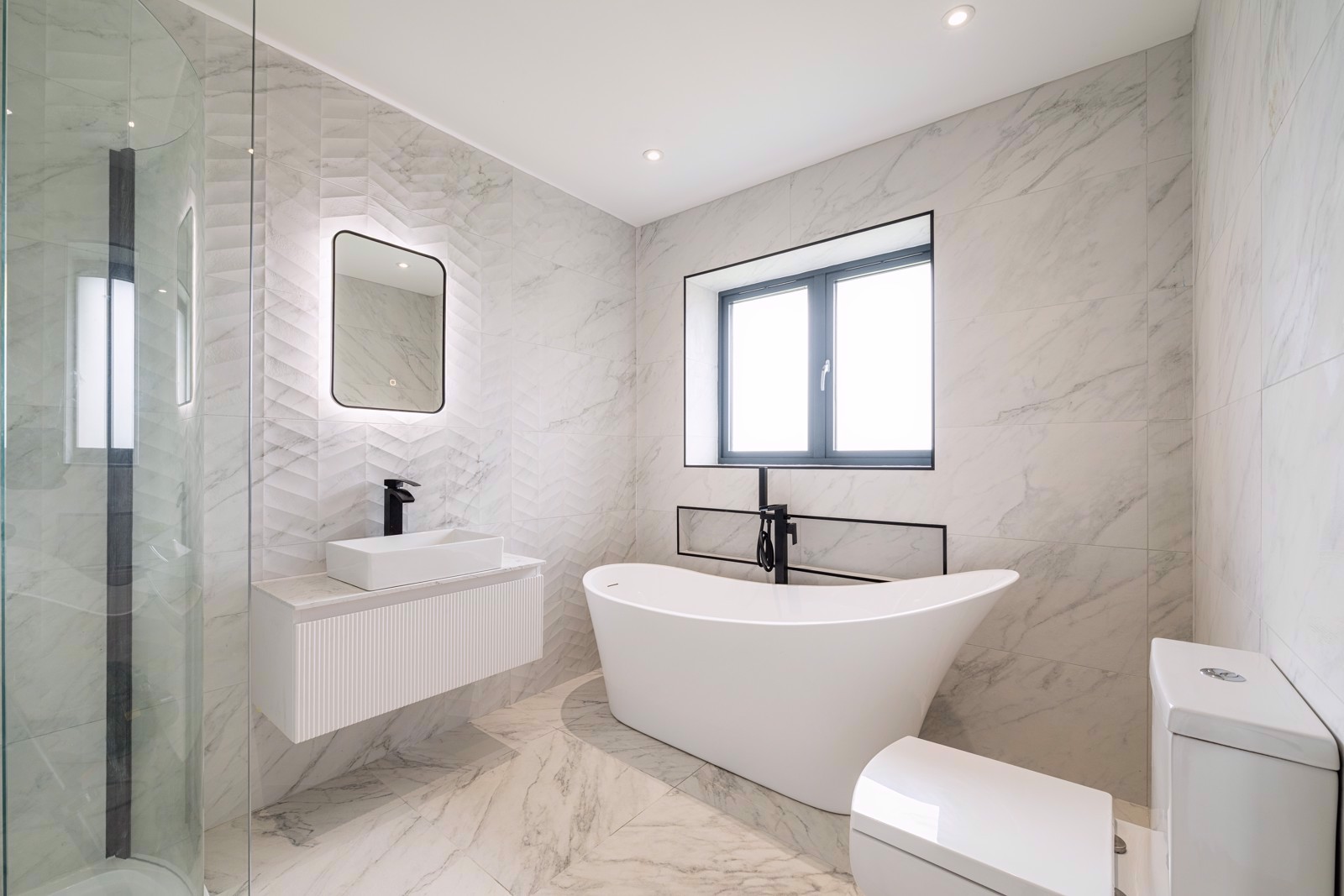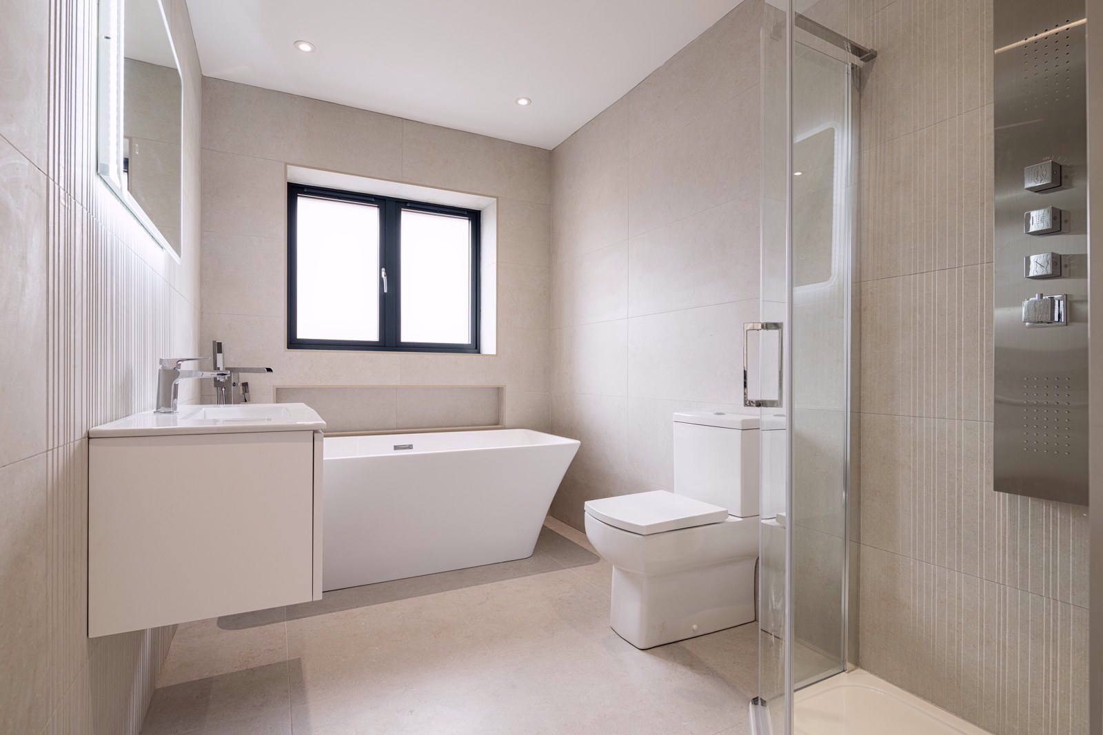 Features on offer include a stunning Master Bedroom with large En Suite Bathroom and connecting His & Hers separate Walk-In Wardrobe and Vanity Room, Large Family Bathroom and Guest Bedroom with large En Suite featuring a 2m Walk-In Shower. These are all finished with a seamless blend of Porcelanosa, Italian and Spanish porcelain and marble tiles.