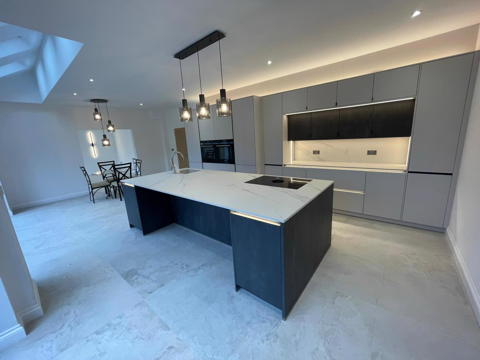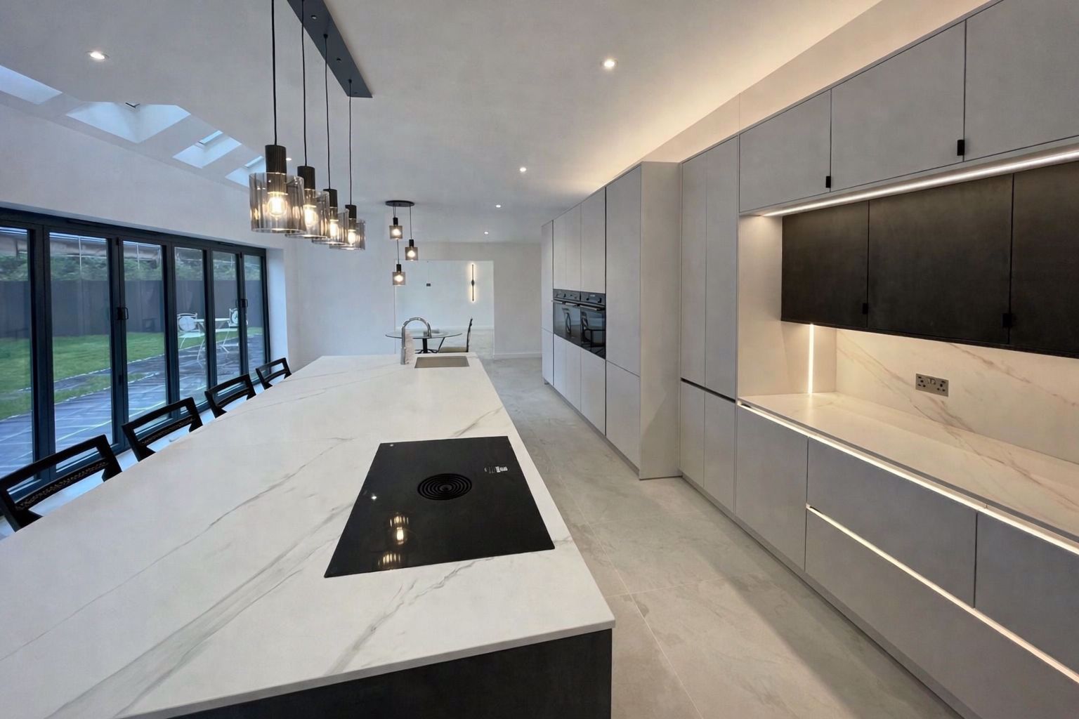 German Hacker Kitchen with Central Island, Induction Hob + Bora Downdraught Integrated Extractor, Large Sink with Quooker Tap.