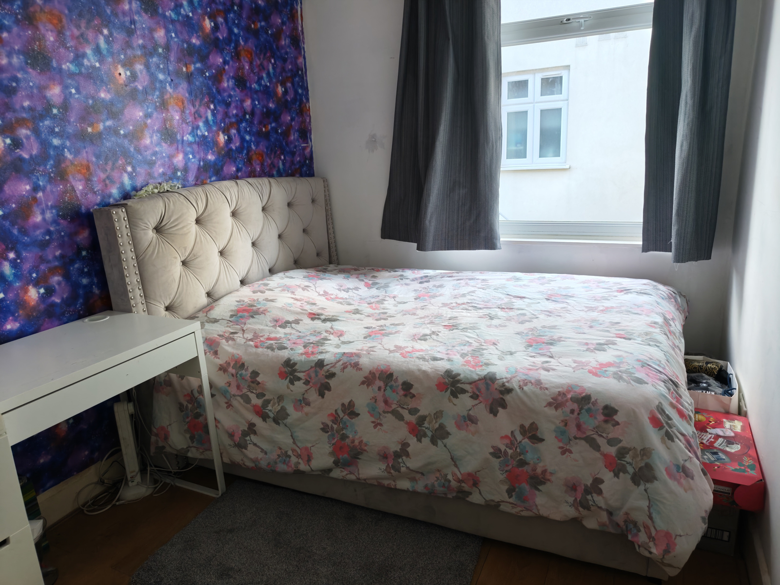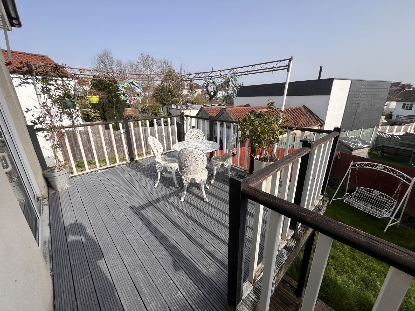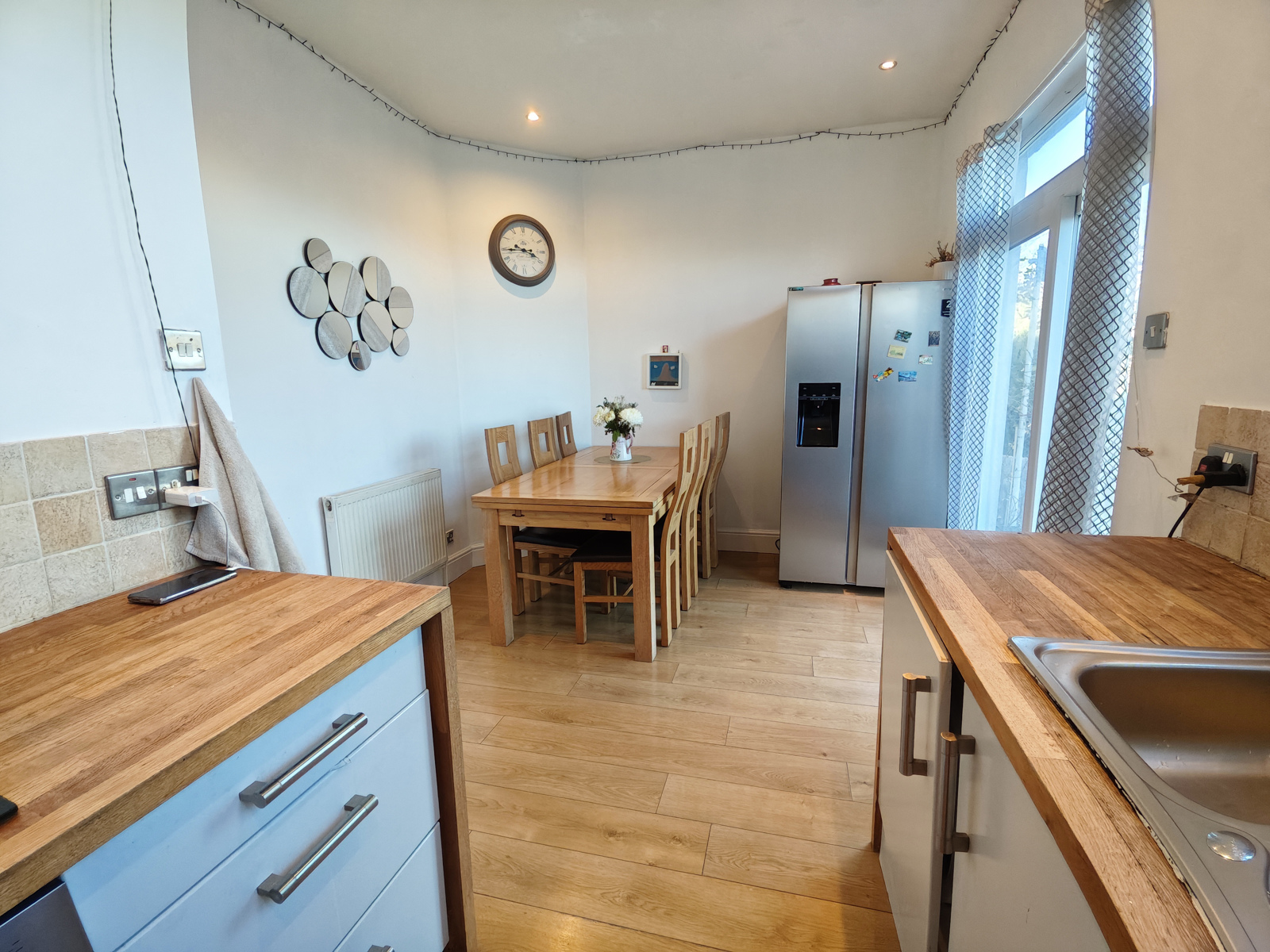 The kitchen/dining room has space for a large dining table. The kitchen has a functional solid wood worktop in need of refurbishment or is ready to be replaced to your own taste. There is a gas hob, electric oven and dishwasher. A sliding patio door leads outside to a room sized elevated veranda overlooking the lawn. Steps lead down to the very private garden with covered room sized decking area and access to the very spacious basement. This provides ample storage and houses the relatively recently installed Worcester Bosch boiler.