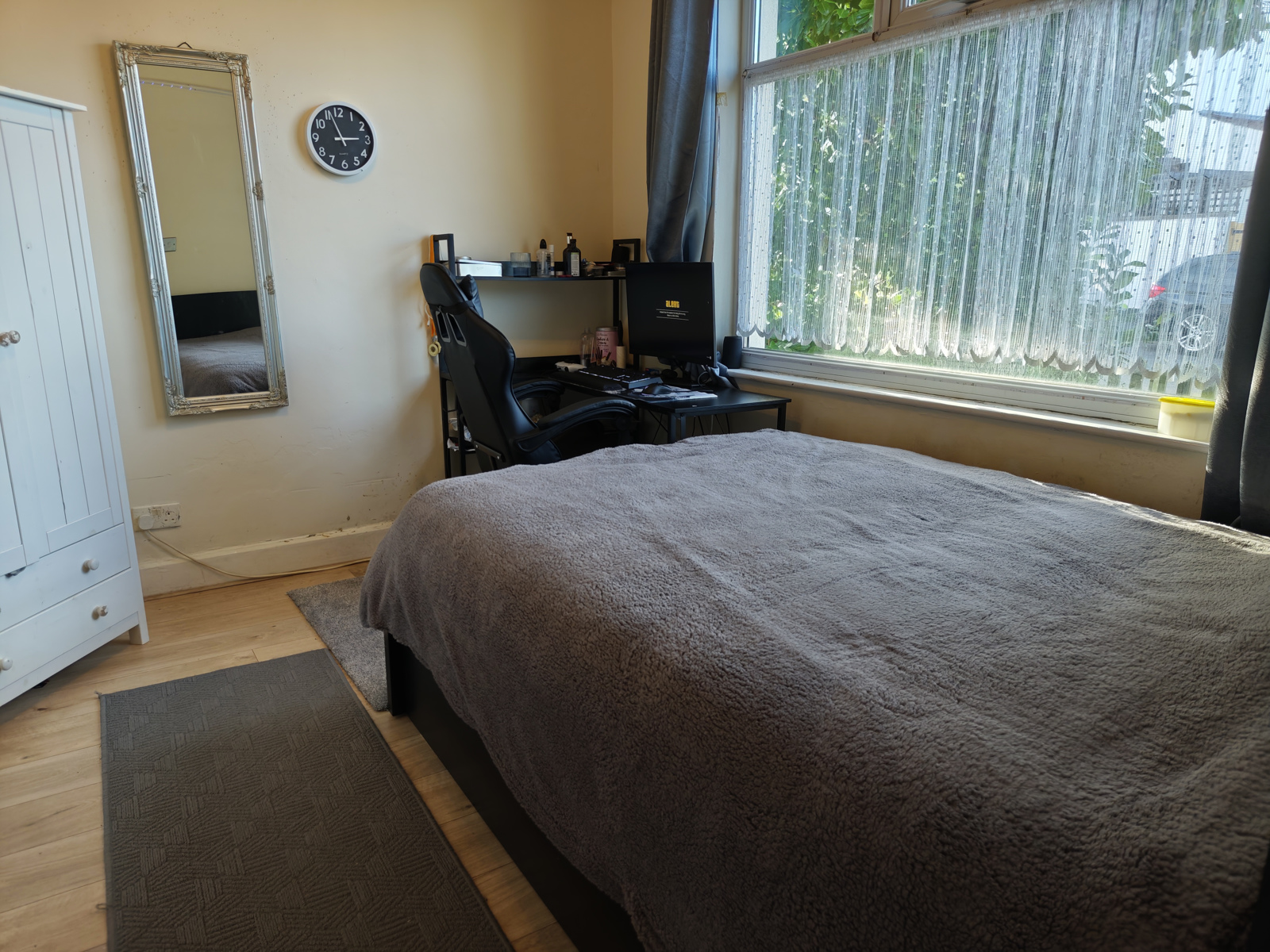 A large reception room has a panoramic bay window resulting in a room with an abundance of light. External walls are insulated making it feel very cozy inside.