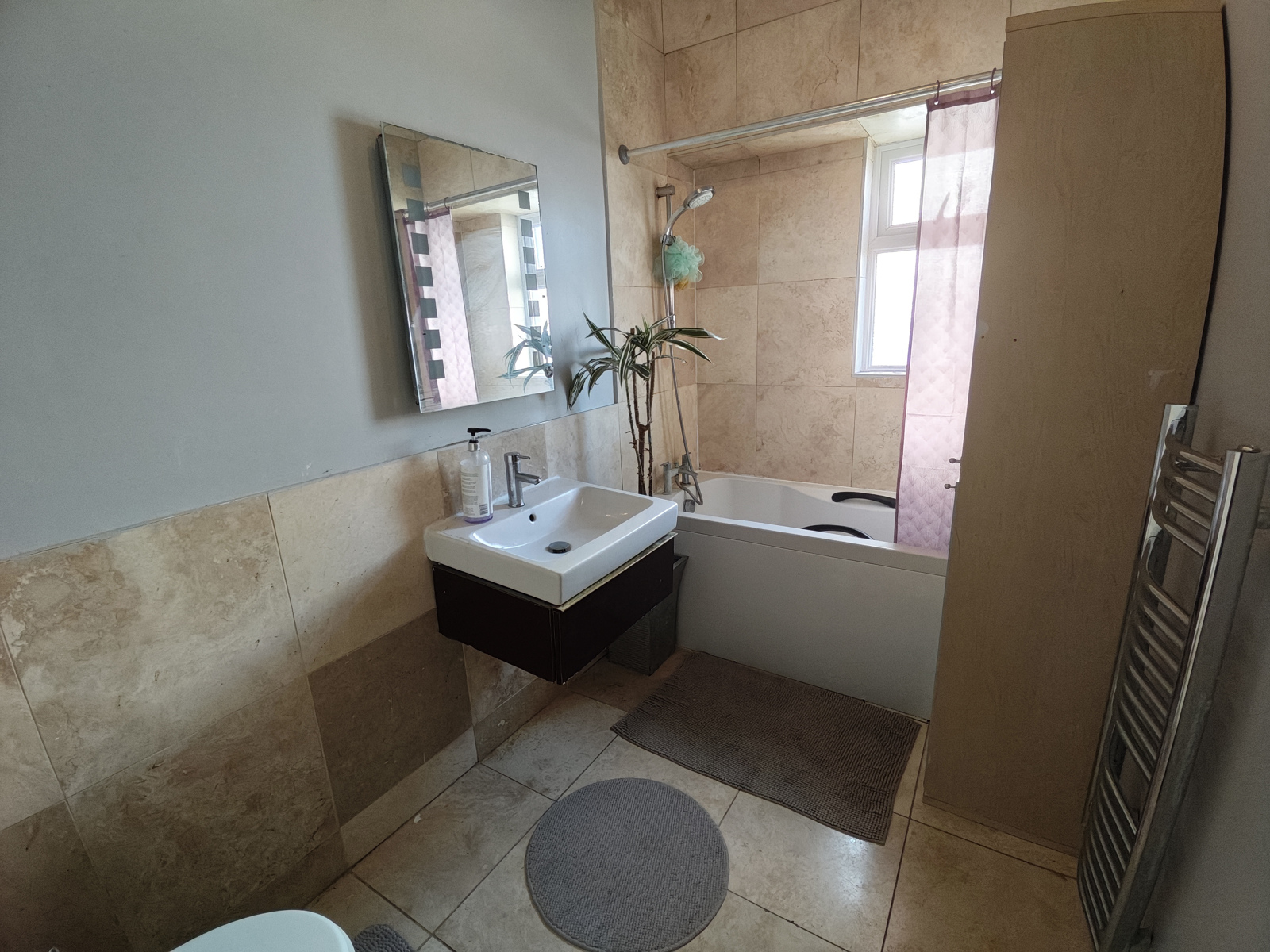 A large bathroom features a powerful over bath shower. There is also an uprated extractor fan which quickly and quietly clears condensation. Potential space for an additional toilet in the large hallway cupboard.