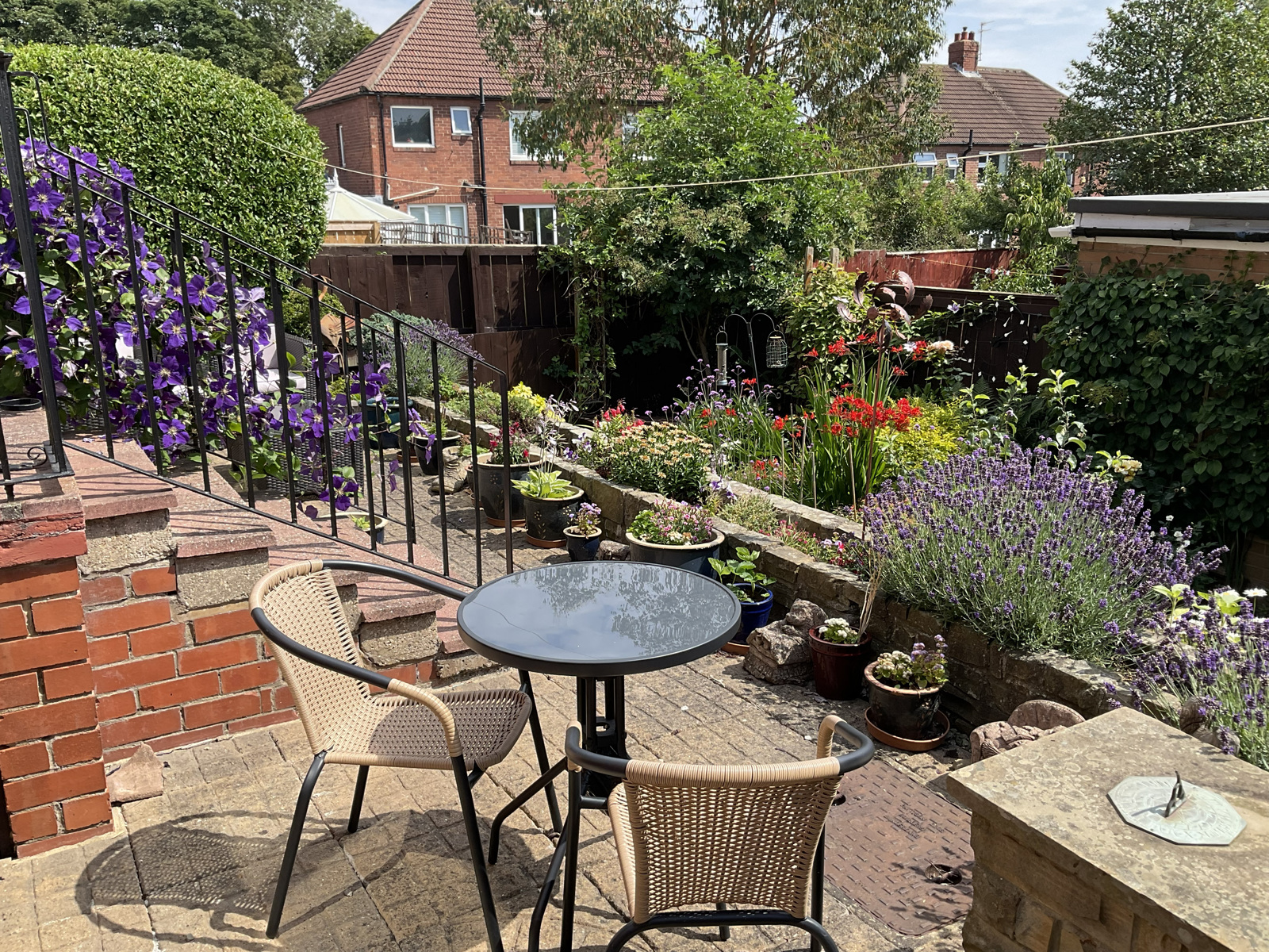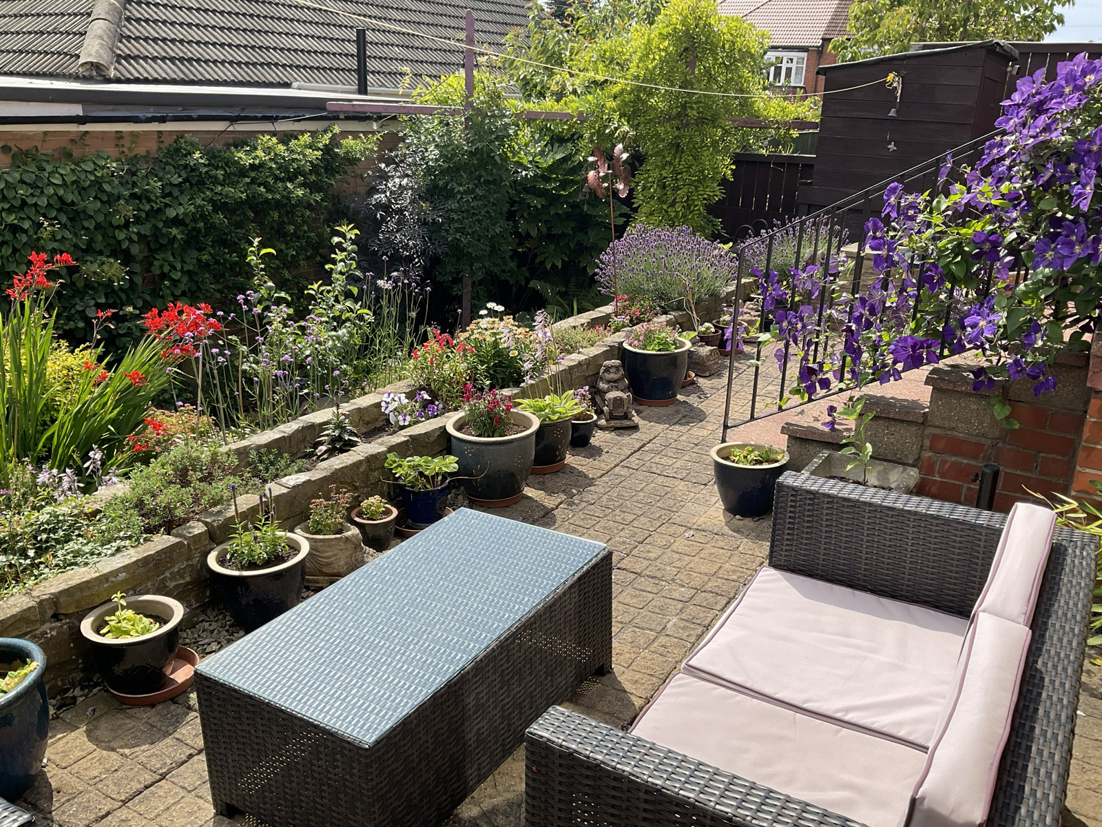 To the right of the garage is a path leading to the rear garden which is south facing. The rear garden is on two levels. The top level is paved and provides a space to relax and enjoy the sun. The lower level is well stocked with a wide range of plants and shrubs.