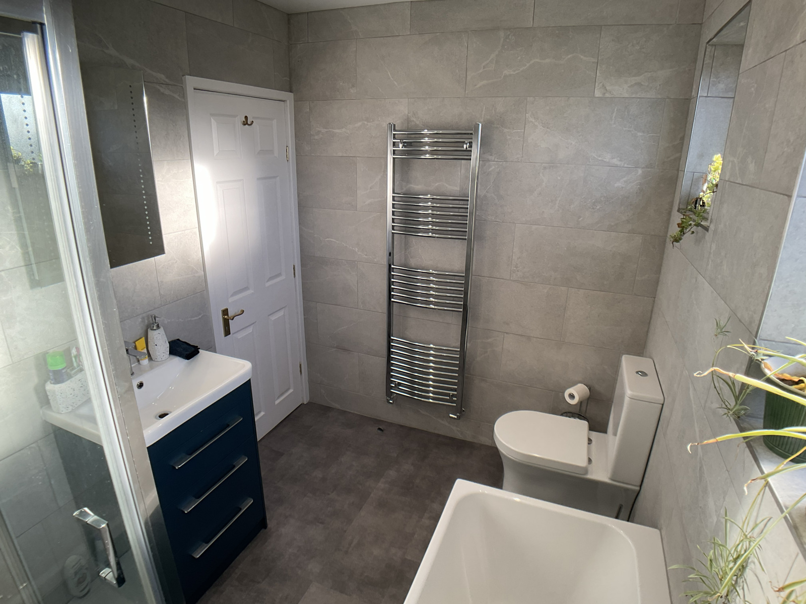 Recently refurbished and incorporating spacious shower, panelled bath, hand basin with fitted cabinet, wc and chrome towel radiator.