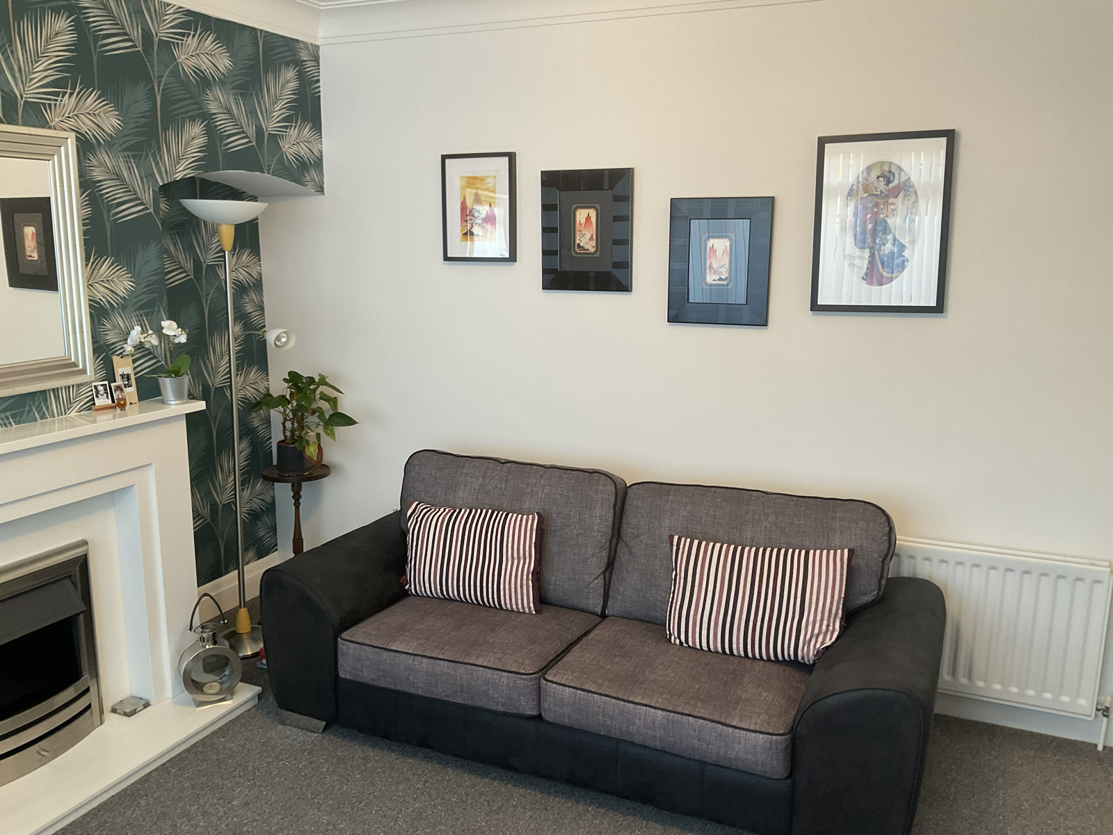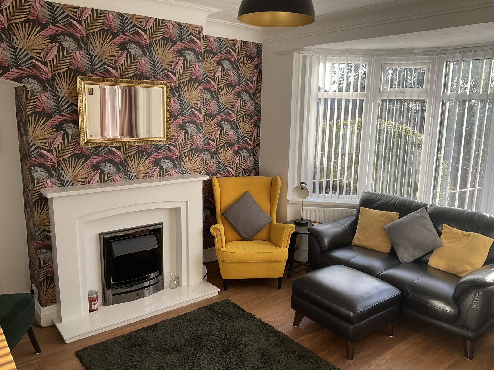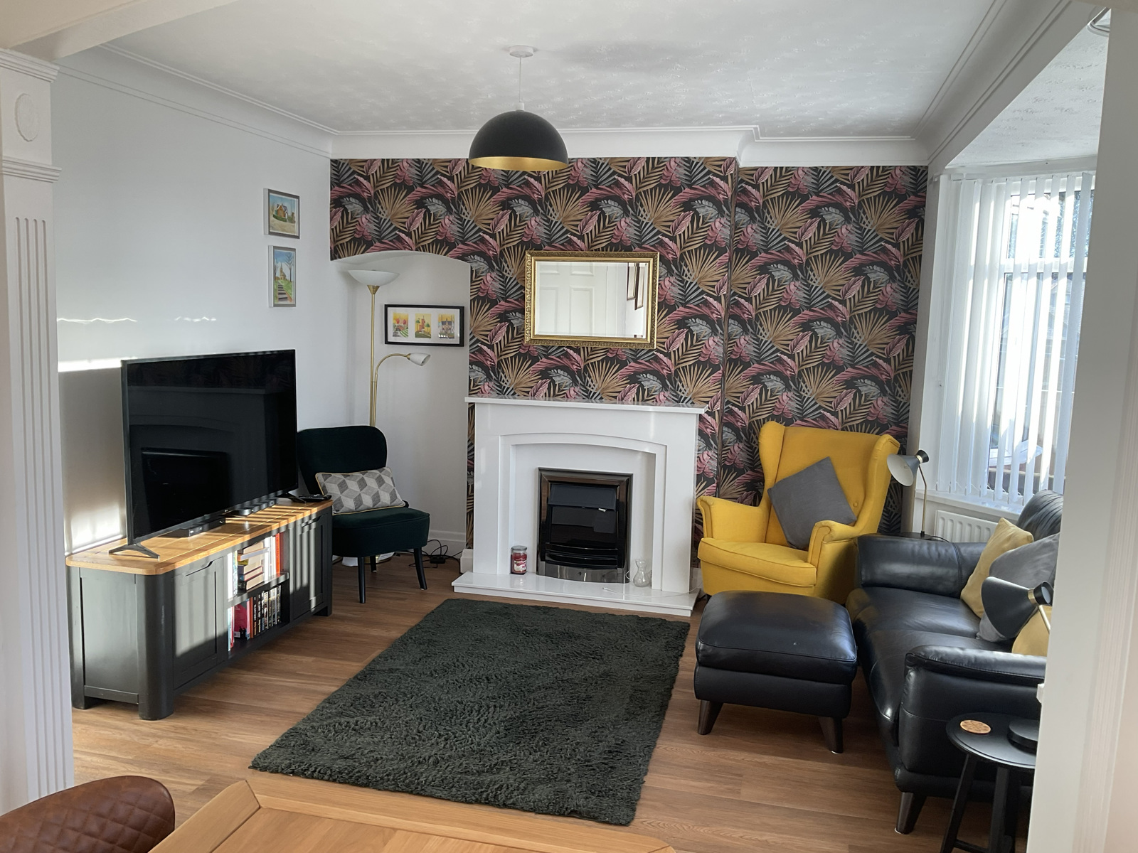 Spacious living space incorporating fireplace with electric fire.