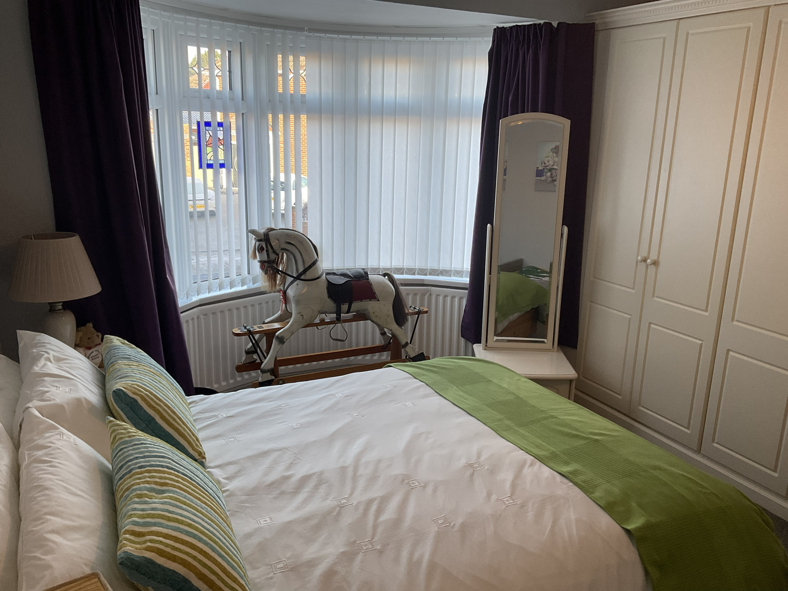 Spacious room with attractive bay window and fitted wardrobes along one wall.