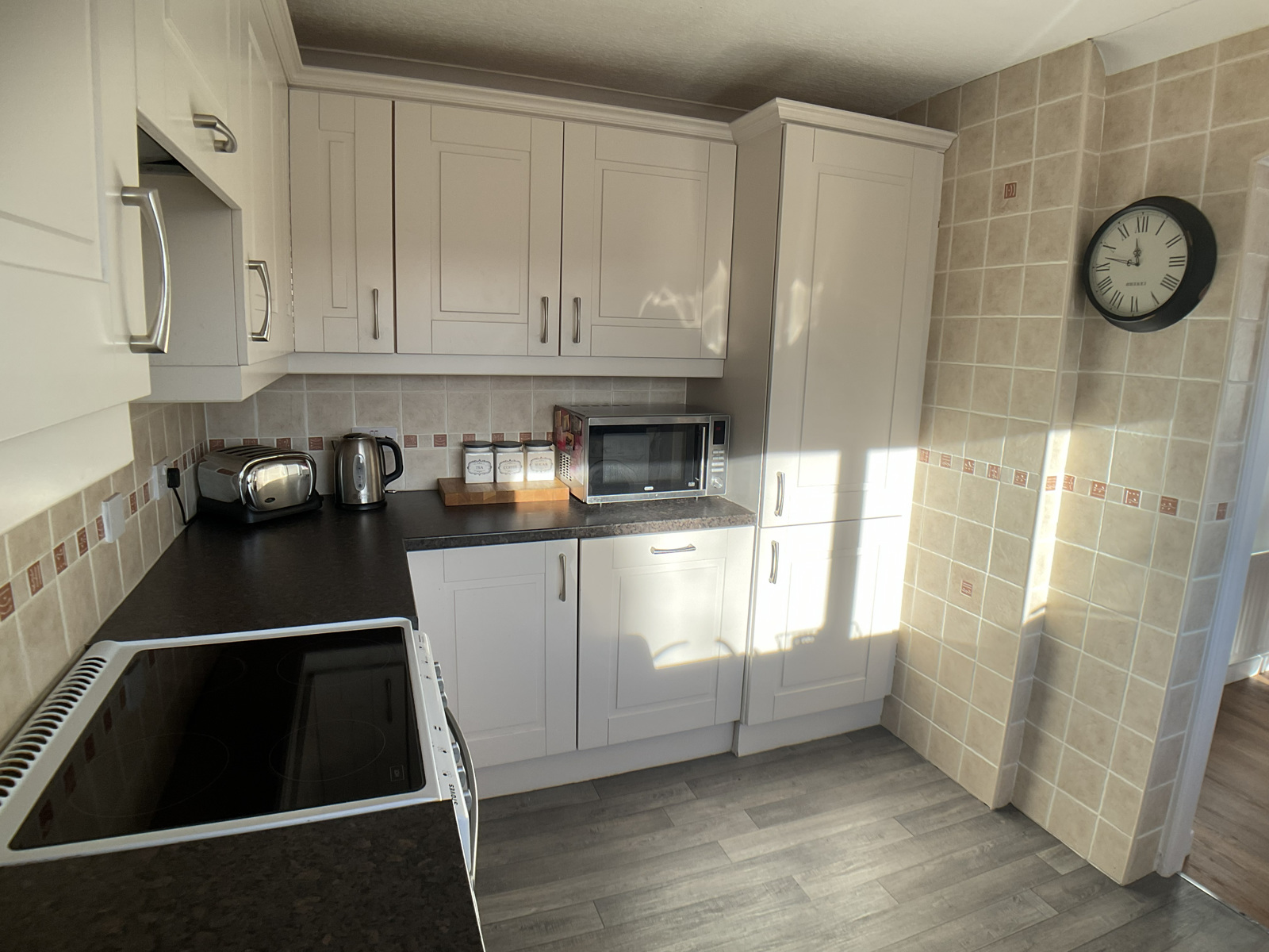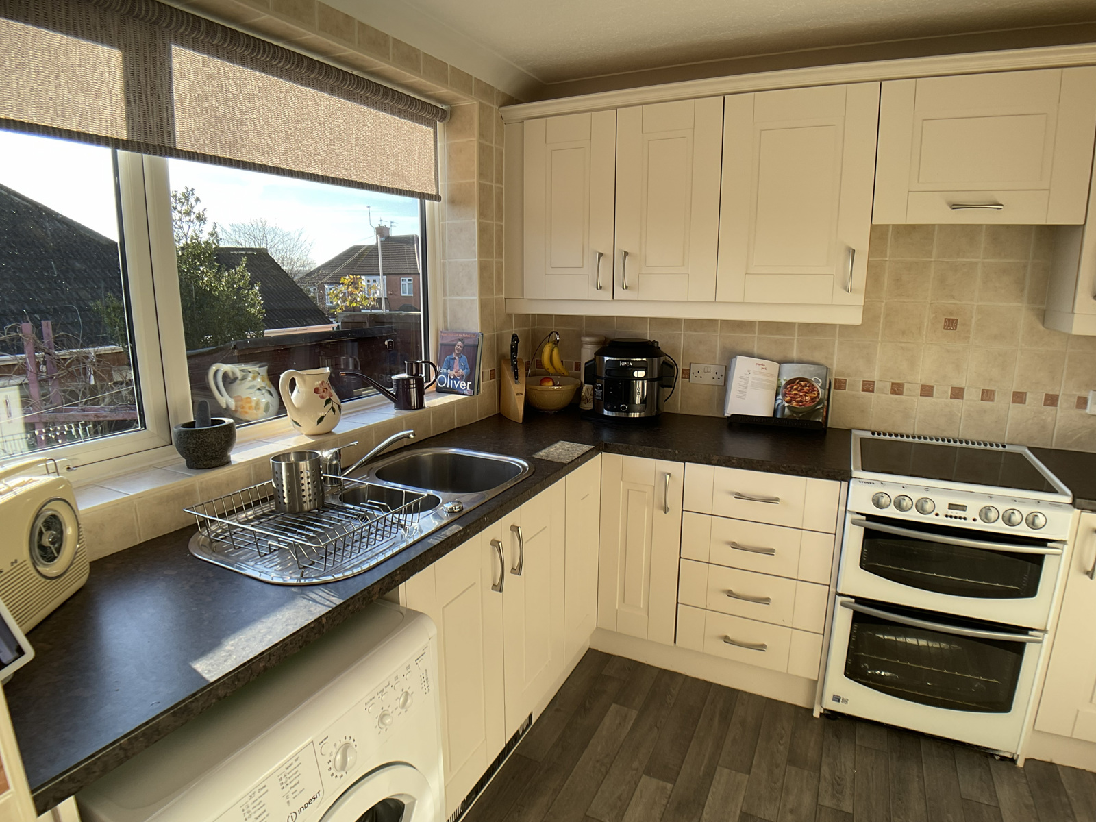 Includes a range of wall and base units in good working order with stand alone hob/grill/oven and washing machine. Units incorporate integrated extractor, dishwasher and tall fridge freezer.