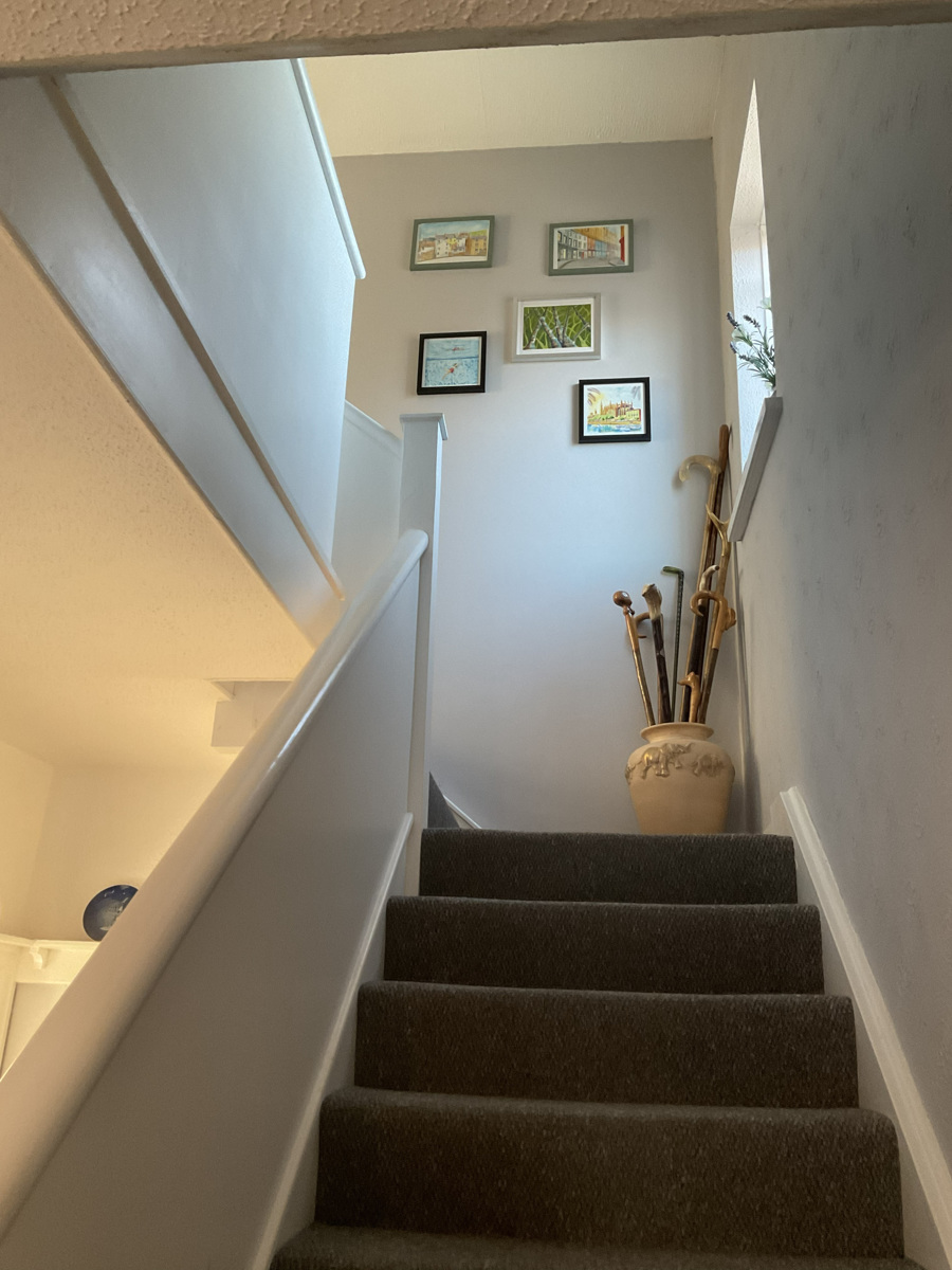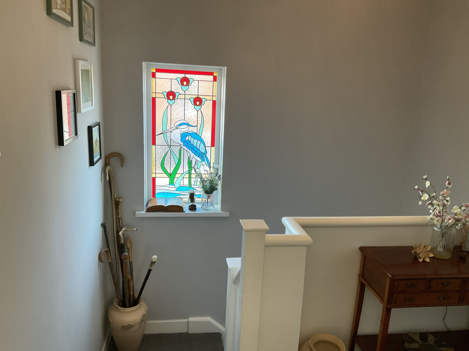 A welcoming space with stained glass windows either side of the main door with stairs to the first floor.