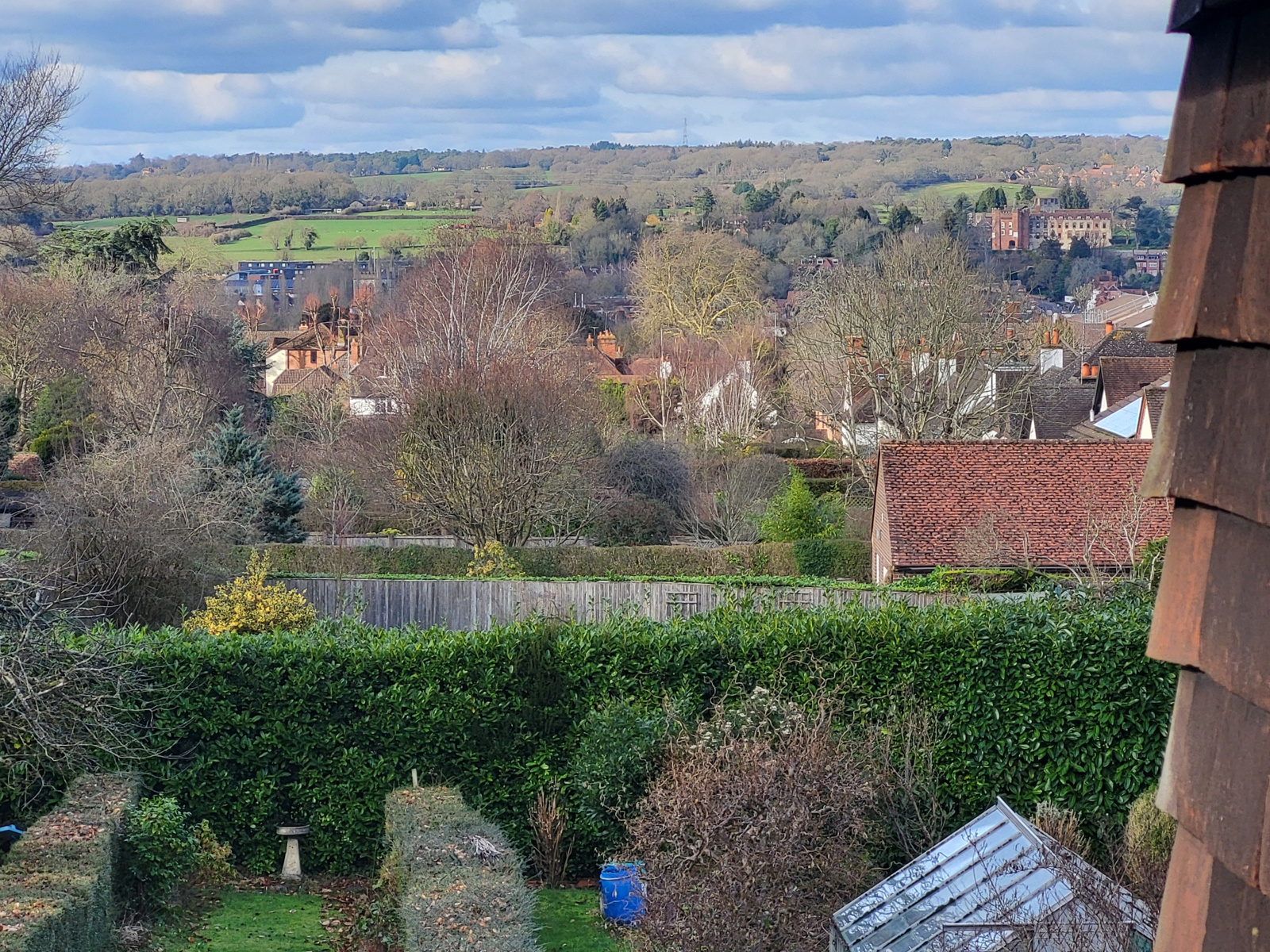 The kitchen is entirely modern, with fitted appliances, and with one of the best views from Great Austins towards Farnham town, including Farnham Castle. The family room and breakfast room areas form an L-shaped space, with sliding doors overlooking the garden. Taken together with the kitchen, these rooms cover an area of around 44 square metres, or about 470 square feet.