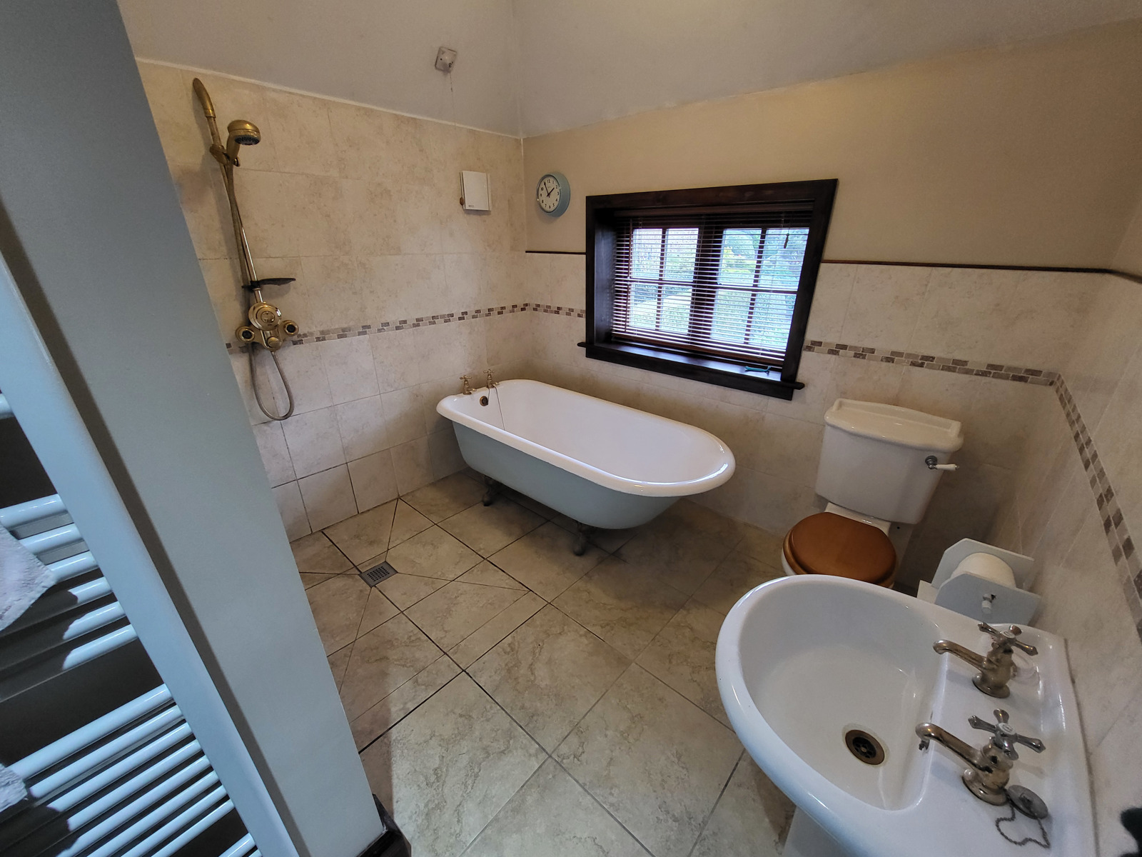 Upstairs there are five bedrooms. Four of them have built-in (original) cupboards. The two largest bedrooms have en-suite modern bathrooms with wet-room showers, and one of them has a walk-in wardrobe. The family bathroom is the original bathroom. There is also a separate toilet in its original location.