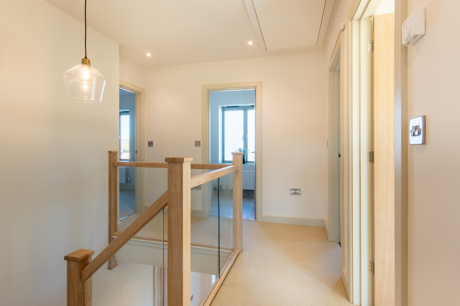 Landing with central glass ceiling light, over staircase with oak handrails and glass panelling.