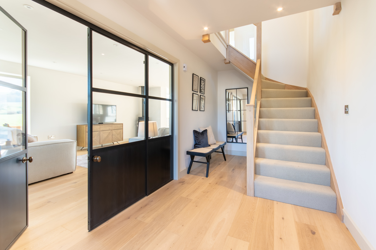 Spacious entrance hallway with engineered oak floor, underfloor heating, double doors to Living Room and stairs to upper floor. Understairs cupboard with light.