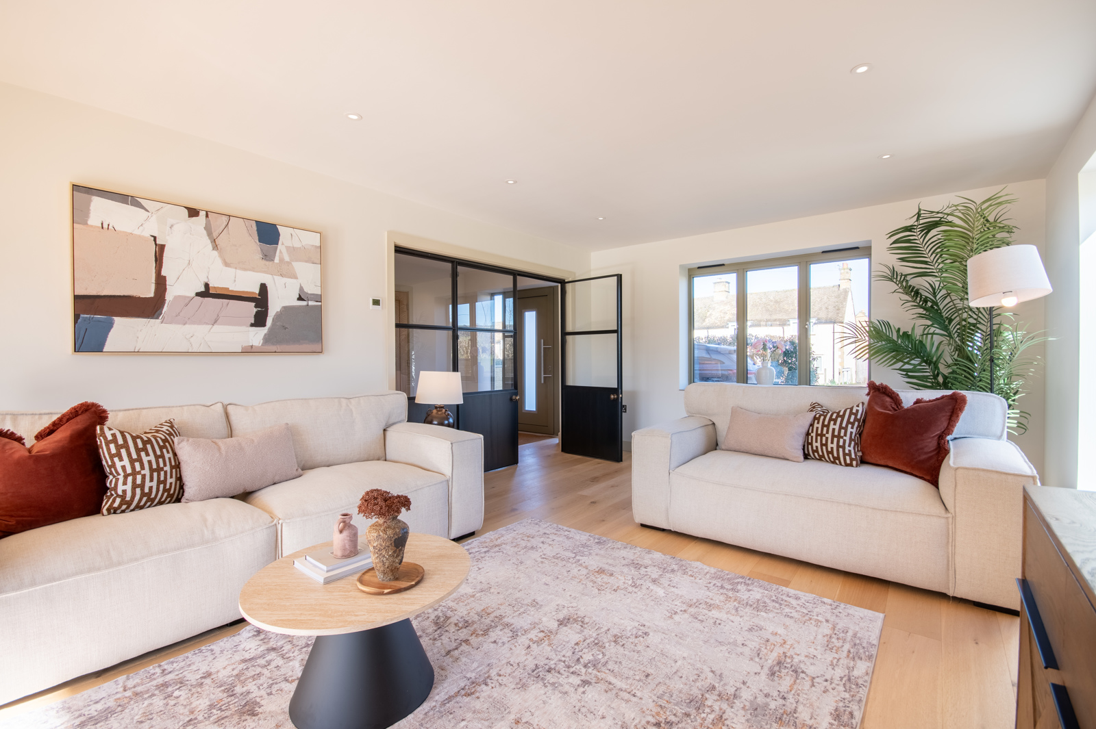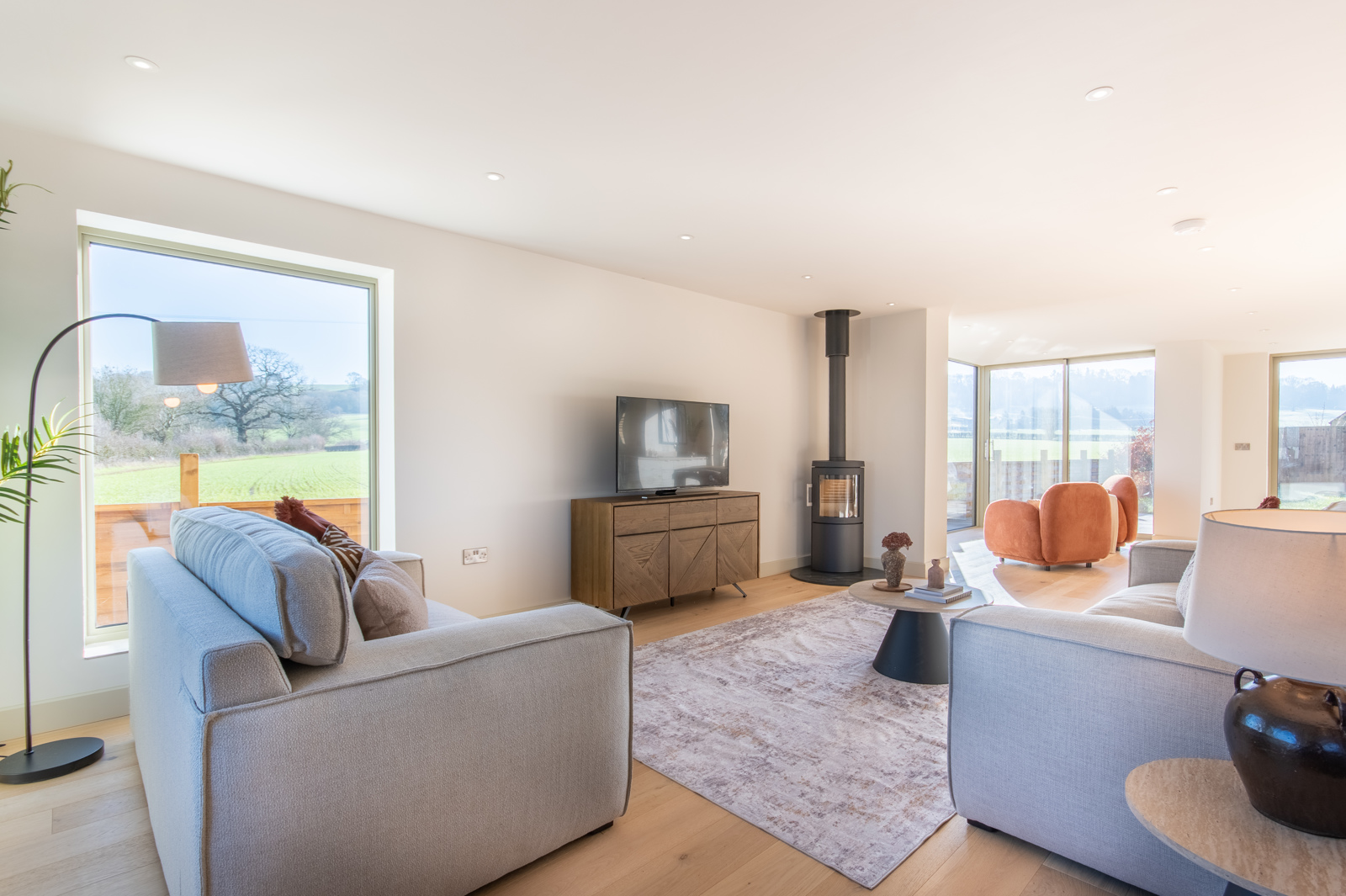 A spacious and light filled family living area with engineered oak floor, underfloor heating, windows to front and side and plenty of space for large furniture. Also featuring a HWAM 3120C contemporary Scandinavian wood burning stove designed for efficient heating and clean combustion. This room opens up to: