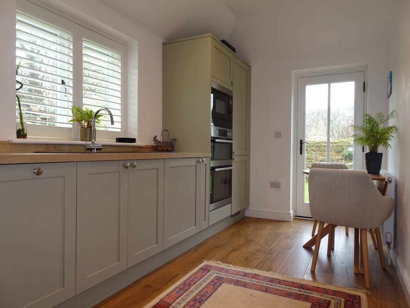 Modern fitted kitchen with wood effect worktops, one and a half bowl sink unit with mixer tap over.