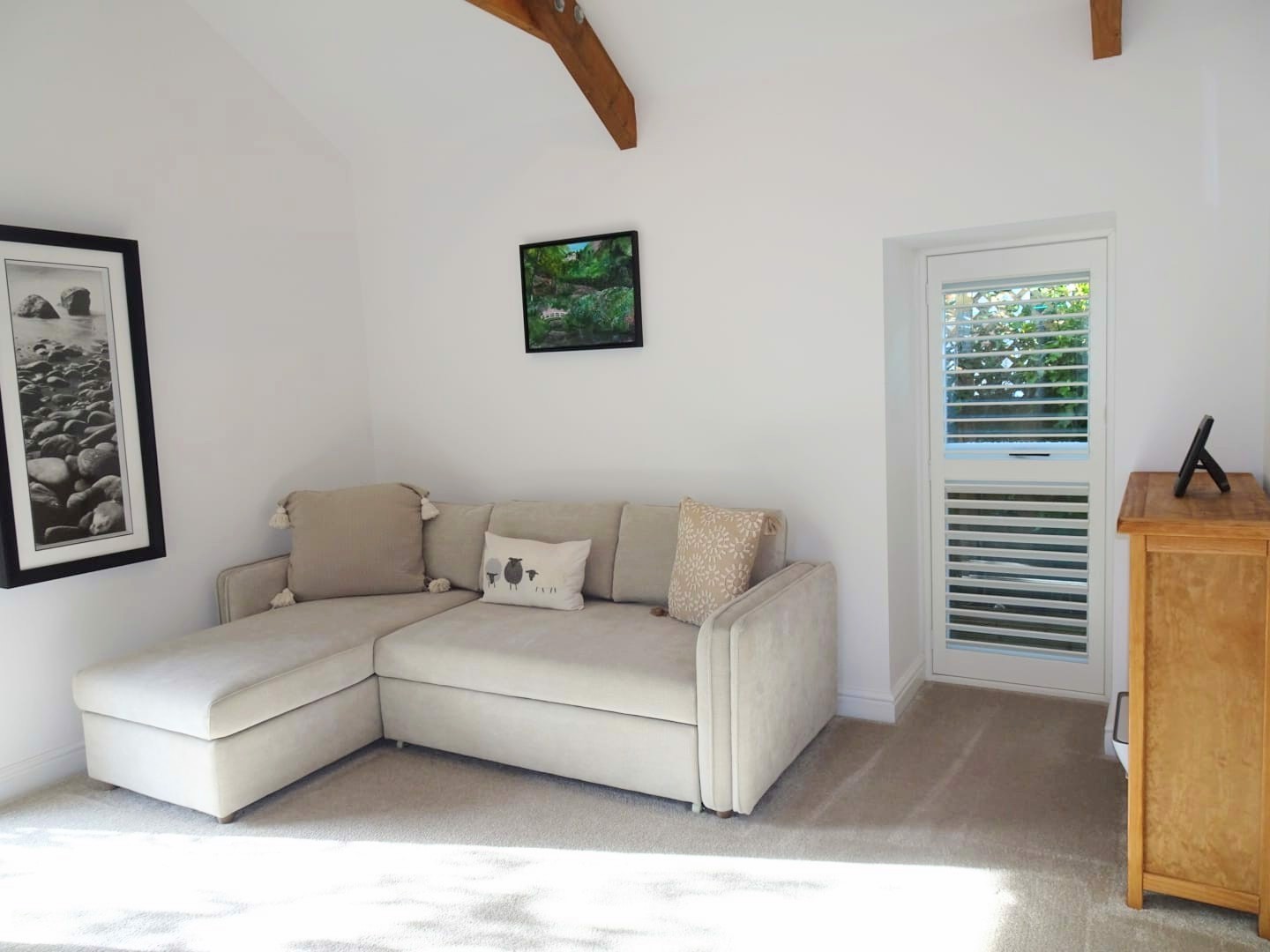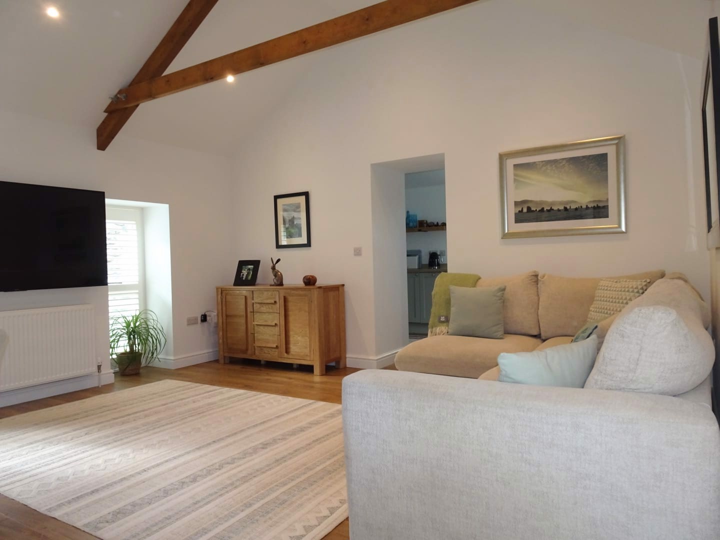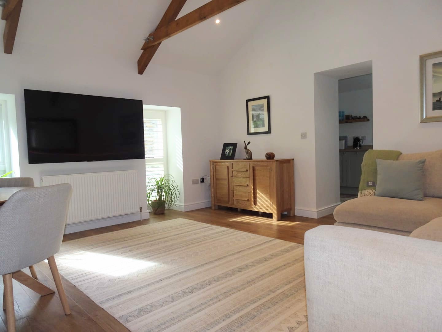 Stepping into the immaculately presented property, the high vaulted, beamed ceilings add a sense of volume and character, whilst the large windows allow the natural light to flood in.